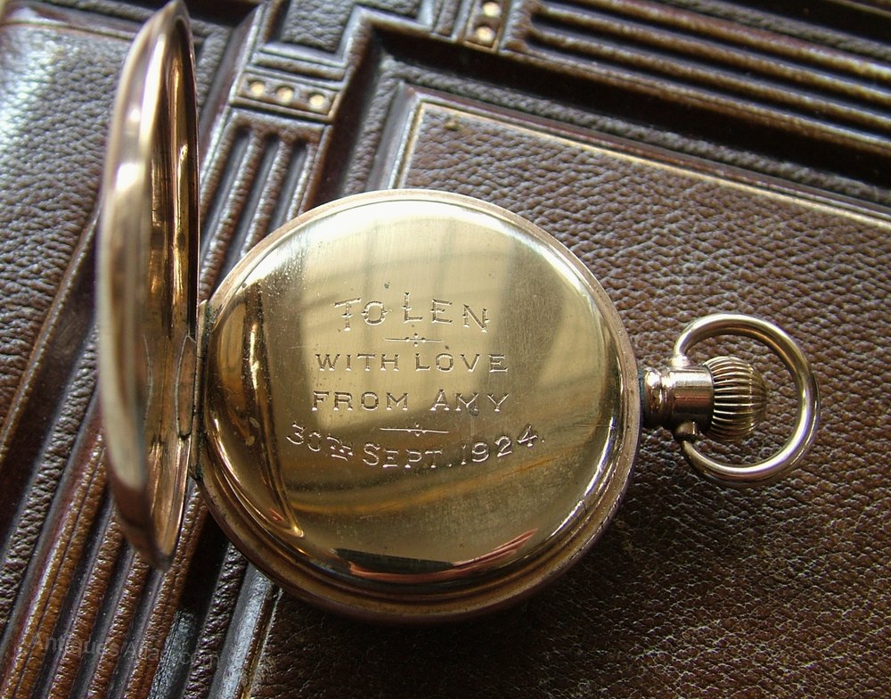 The watch has a Swiss 15-jewel stem-winding movement which is ticking away nicely. The movement is protected by an inner hinged cover which has been engraved to read, 'To Len, with love from Amy, 30th September 1924'.