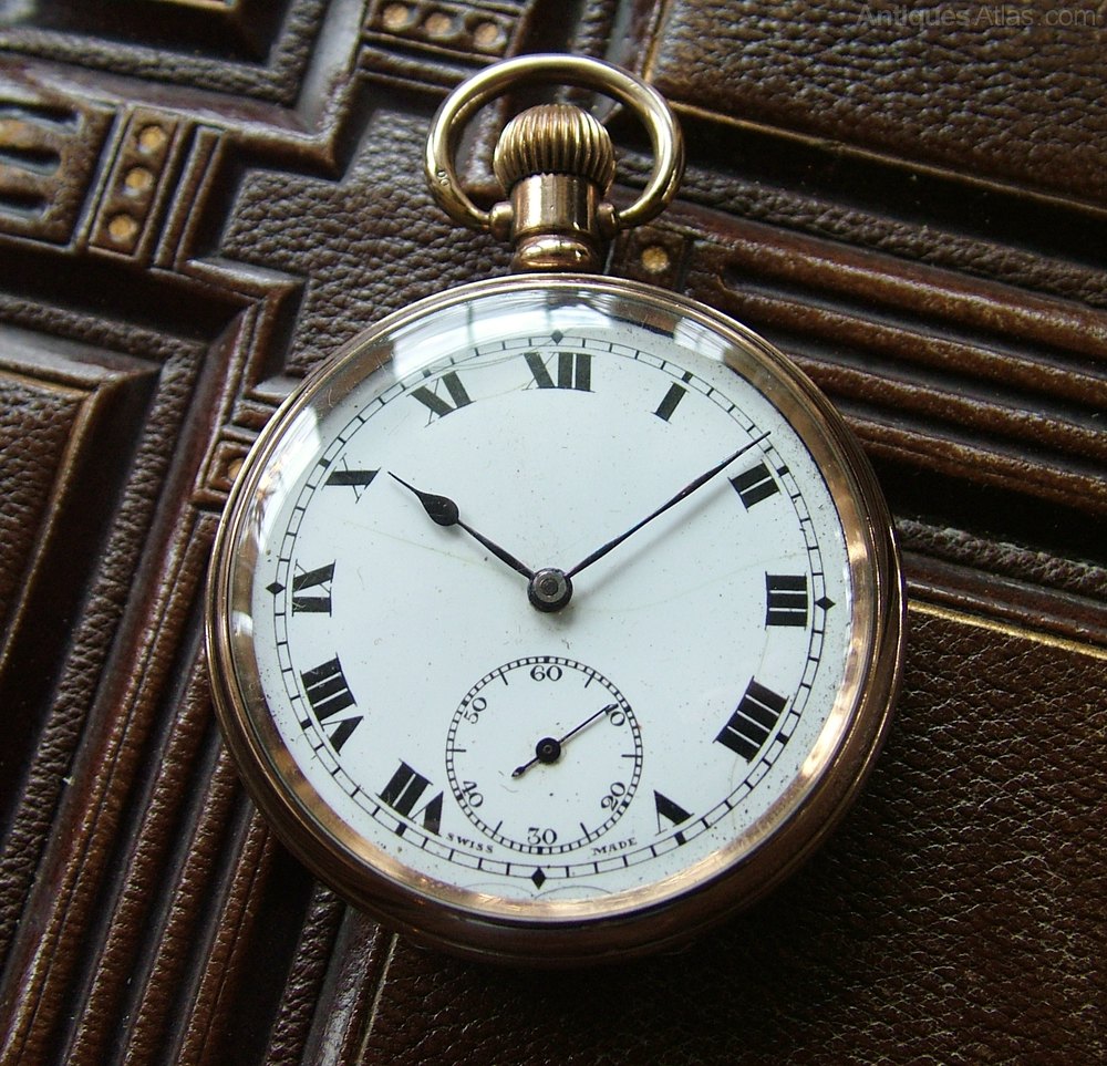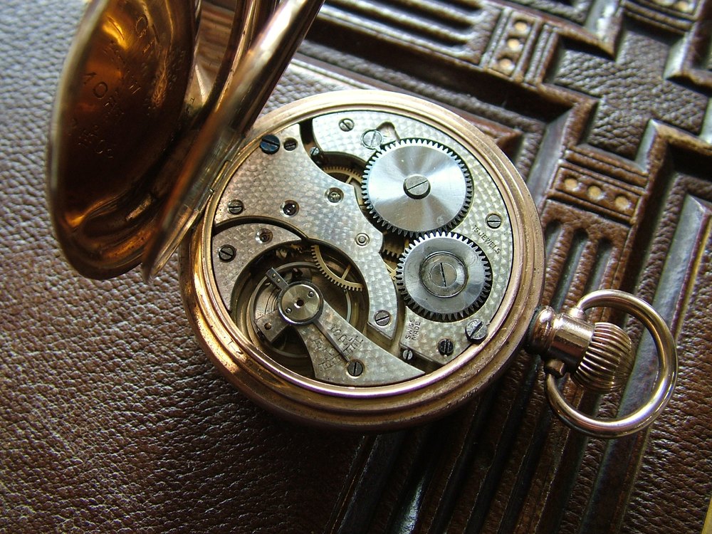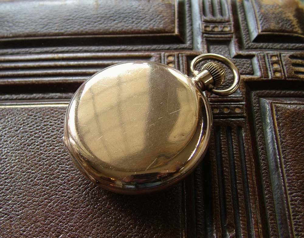 The watch measures 50mm diameter excluding the winding stem and the loop. The case is gold plated and was made in England by the Dennison Watch Case Company. The case has general surface marks commensurate with its age, and a small indentation to the side.