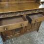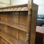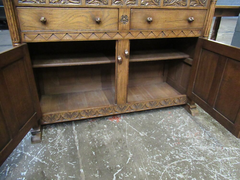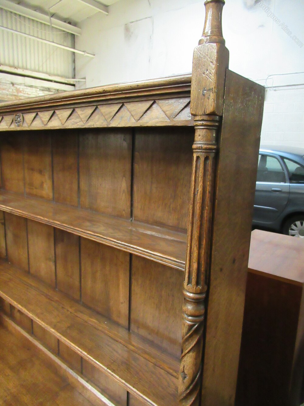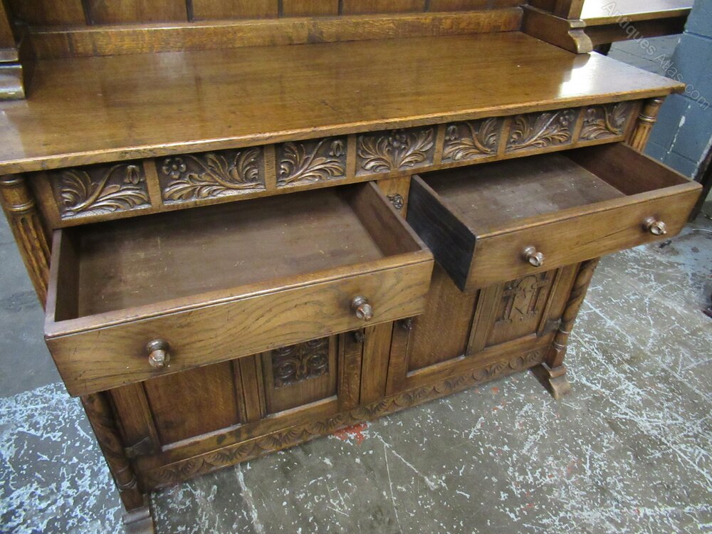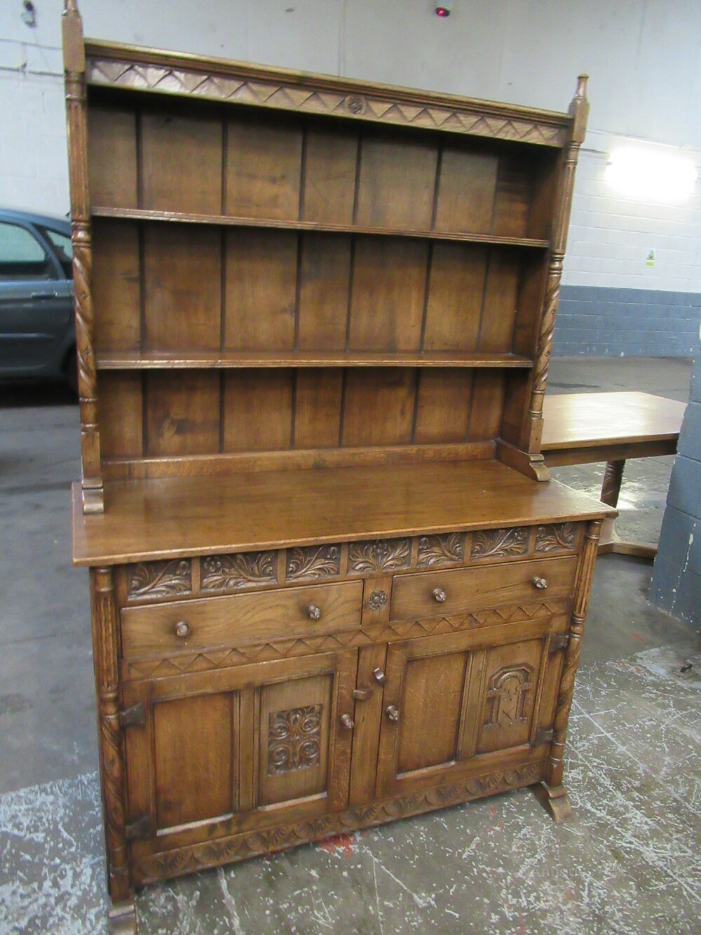 A 1920s oak dresser and rack , the top with twist oak side pillars and top finials, carved detail across top top. The Base with two drawers , then two cupboards below , The dresser front has carved decoration .