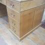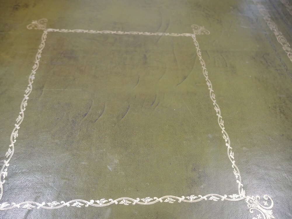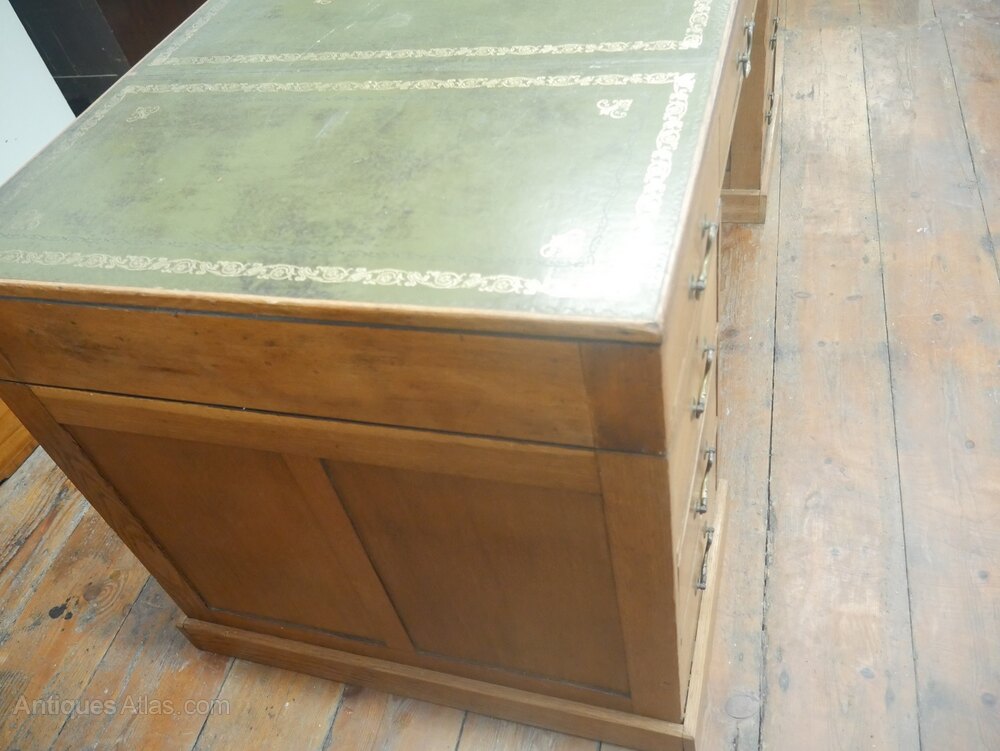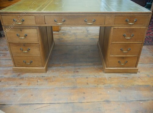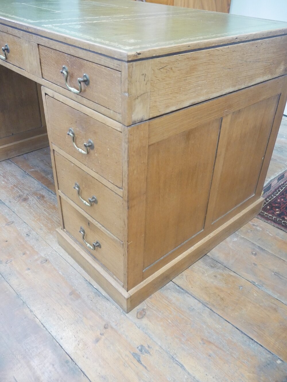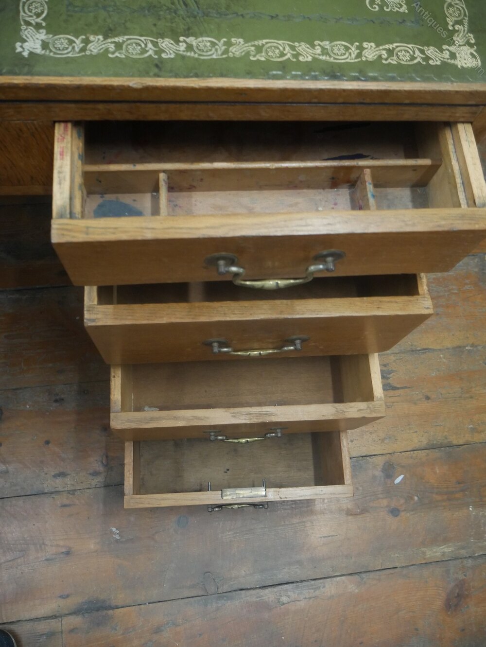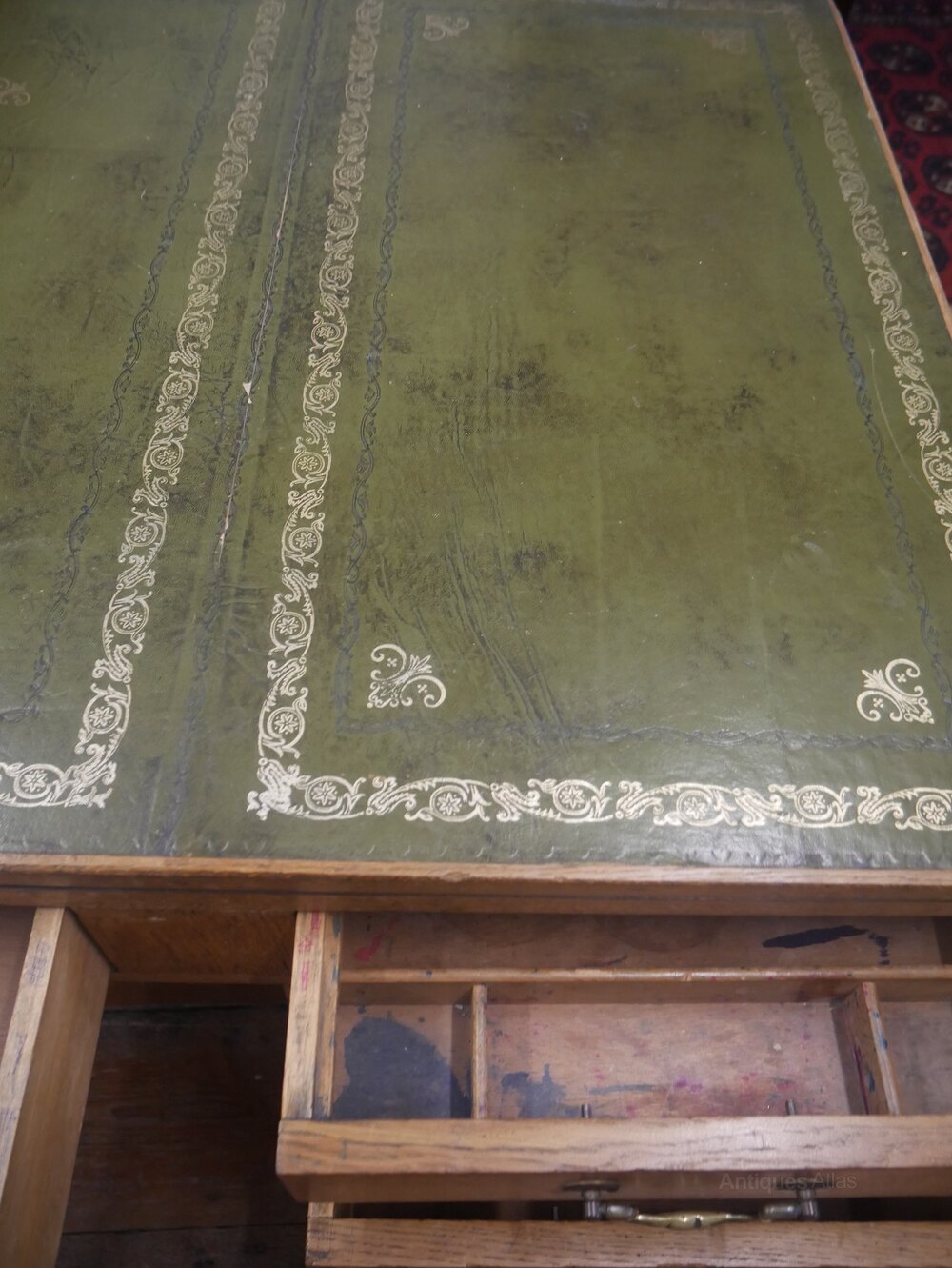 A good quality oak kneehole desk with a green tooled leather inset. The desk has three graduated drawers to the left, one double deep drawer, a central drawer with four graduated drawers to the right hand side. The desk is in good strong condition, the drawers are free running, some wear to the leather top, and consistent with age and use. The kneehole height is 61.cm, the desk splits in three parts for moving. Extra photos available. Dated around 1900s.