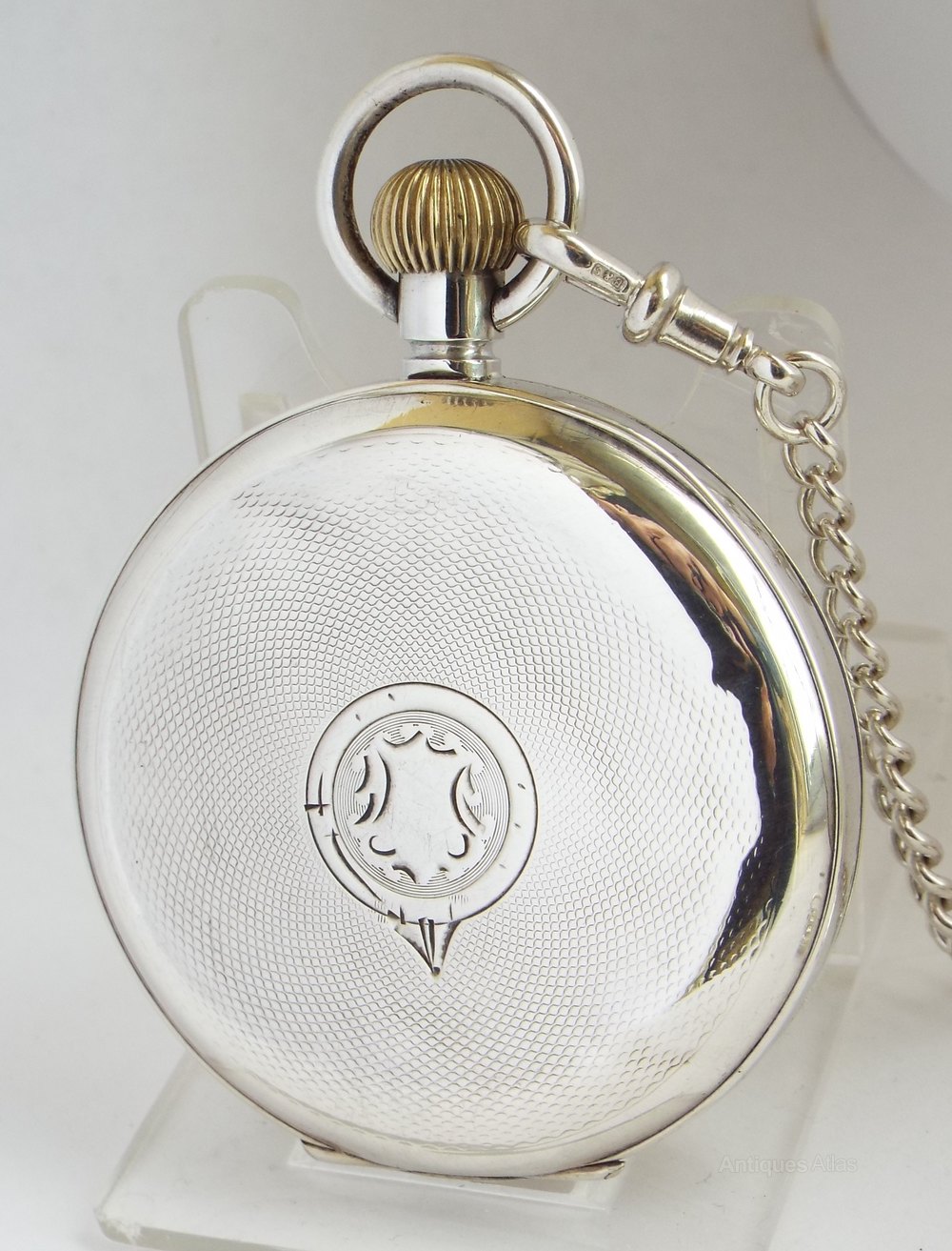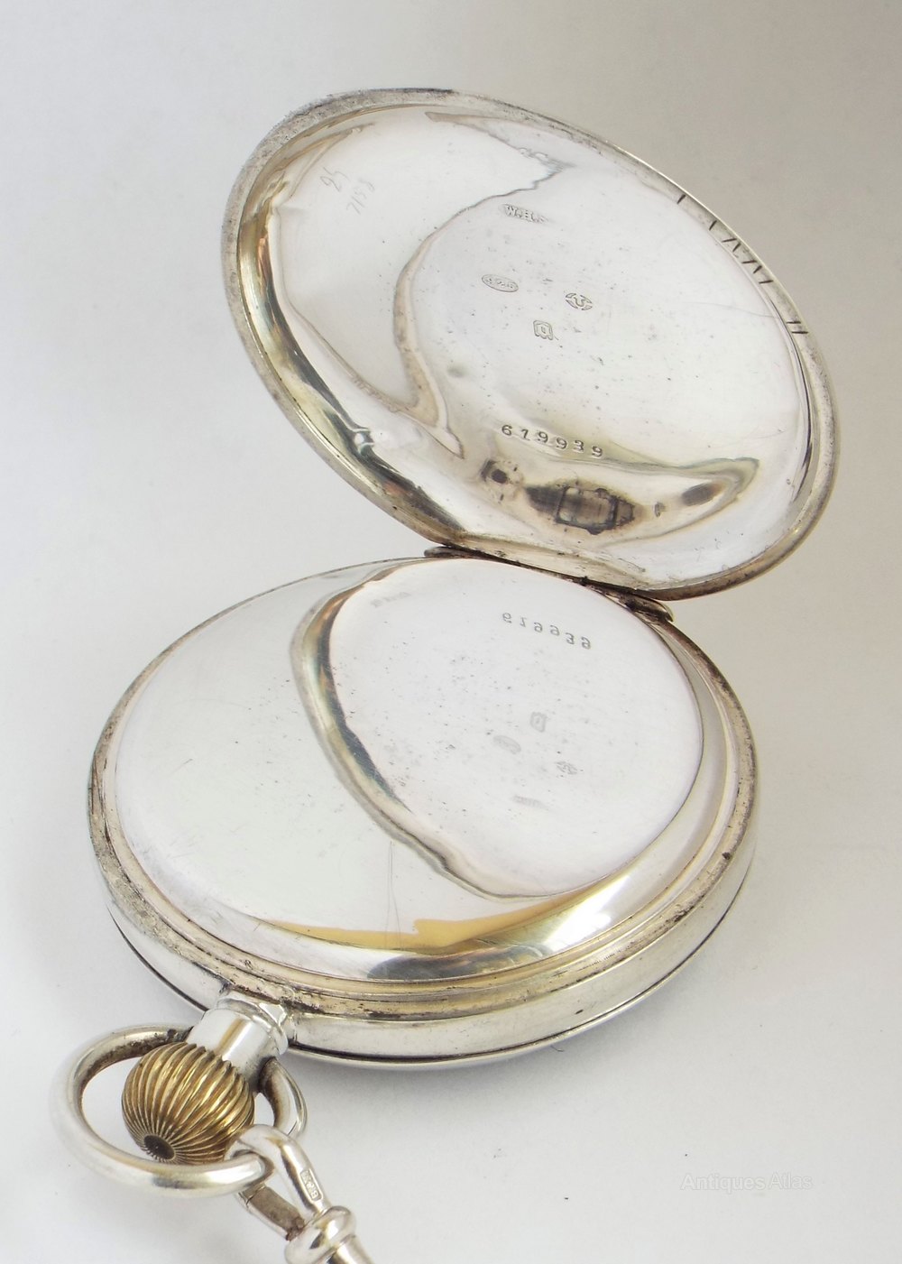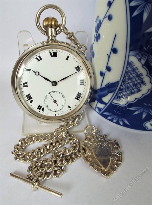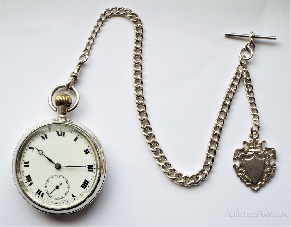 The watch comes with a single chain & fob the chain measures 24.5cm long including the T-bar and the clasp. Each of the links has the lion silver mark and the T-bar is hallmarked for 1911. The fob is hallmarked for Birmingham 1920.
