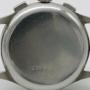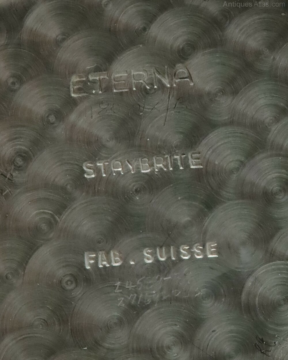 An oversized stainless steel case with well shaped lugs, tapering slightly to the ends. A three piece case design with a snap on case back and bezel. Original, or certainly period crown and pushers. Serial numbers stamped to the case back and signed Eterna to the inner.