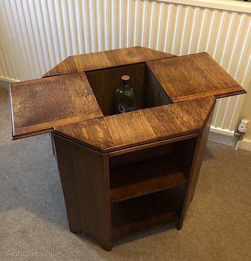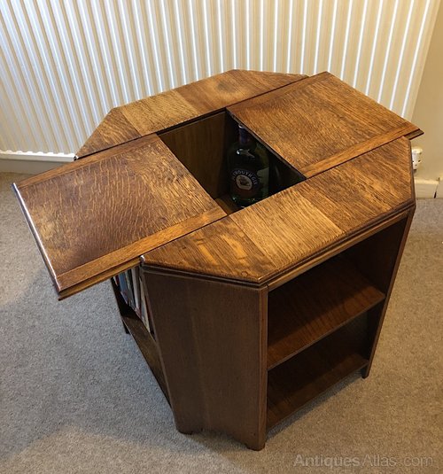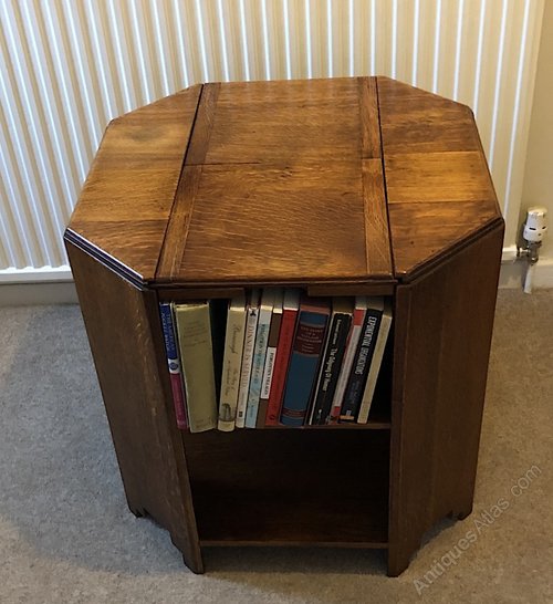 The table is of an octagonal form with four flat panel legs extending down from the octagonal table top to the floor supporting four small bookcases and a lower flat shelf. What makes this particular table particularly unusual is that the top has two sliding panels that pull out to reveal a drinks cellar perfectly sized to house ones favorite tipple. The table was designed to allow one to sit and read ones favorite book and then slide open the the table top and poor oneself a relaxing drink. It conjures up a very pleasant image. Variations of the hexagonal book table were made by Heal & Son ltd from the the 1920s and into the 1930s. This is the only example we have encountered that incorporates a drinks cabinet under sliding panels in the top, which suggests it may be rather rare. The Heal octagonal antique tables were pretty much of set dimensions and this example is no different in that respect measuring 24 inches (61cm) high and 23.5 inches (60cm) deep and wide.