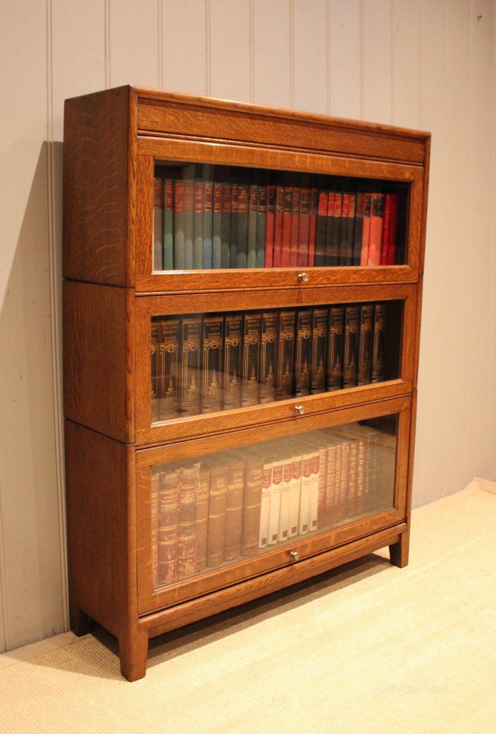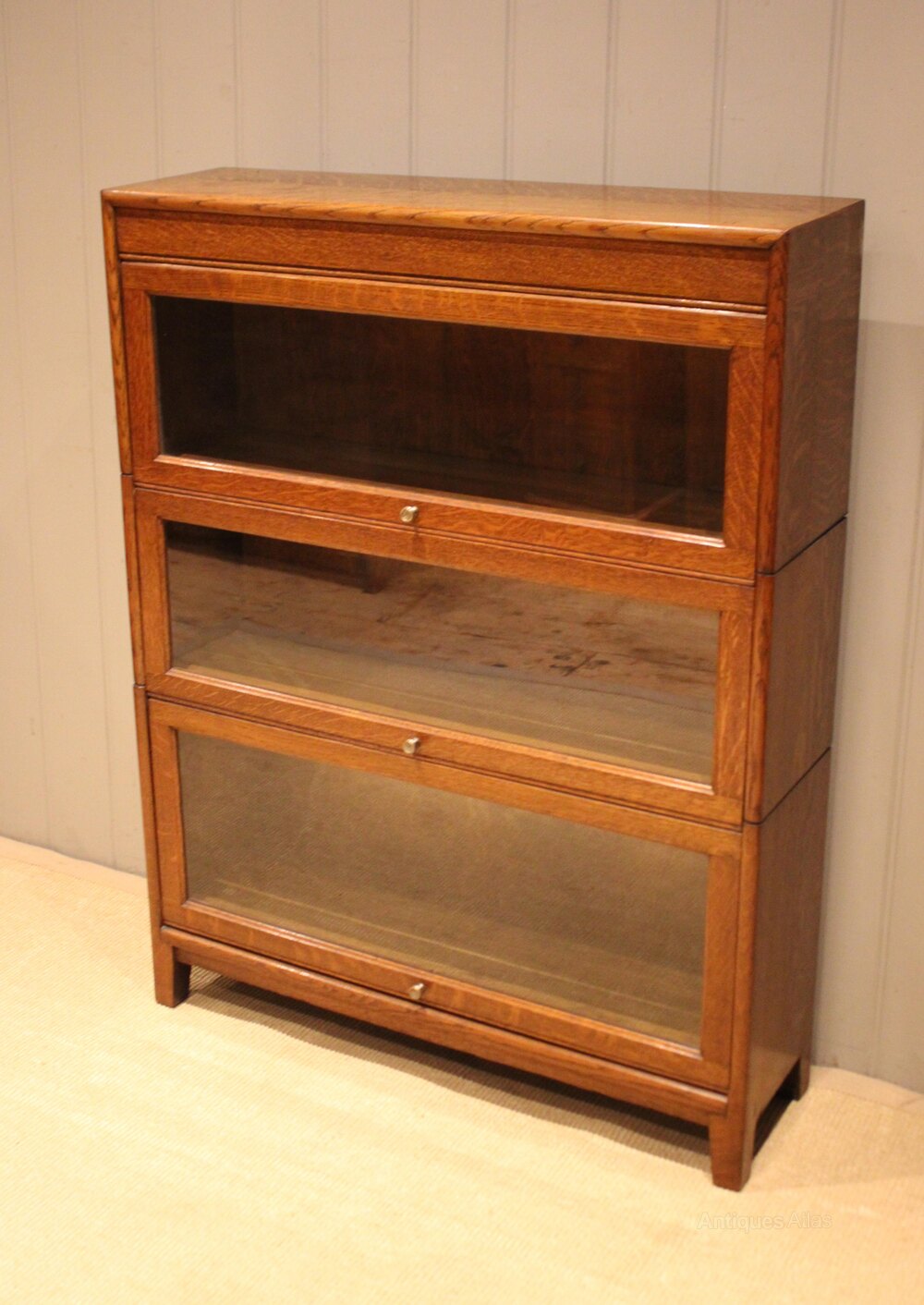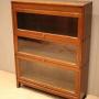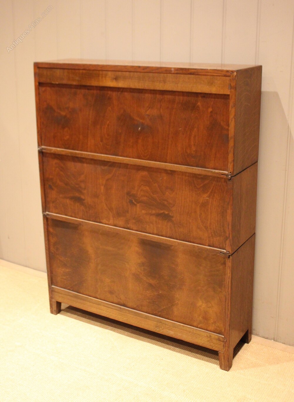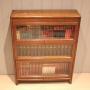 1930s oak stacking bookcase having three tiers with glazed up and over doors , raised on short straight feet.