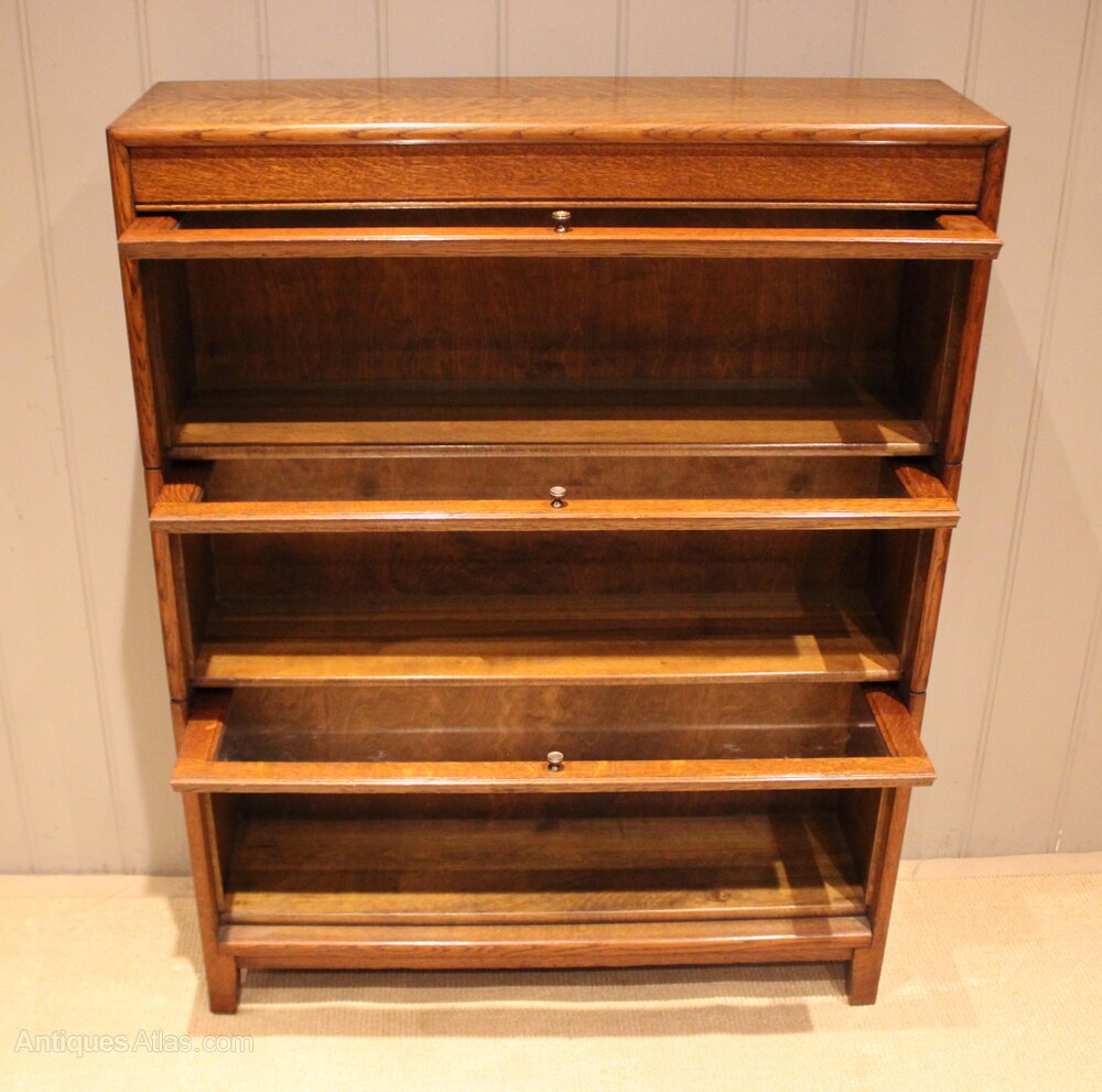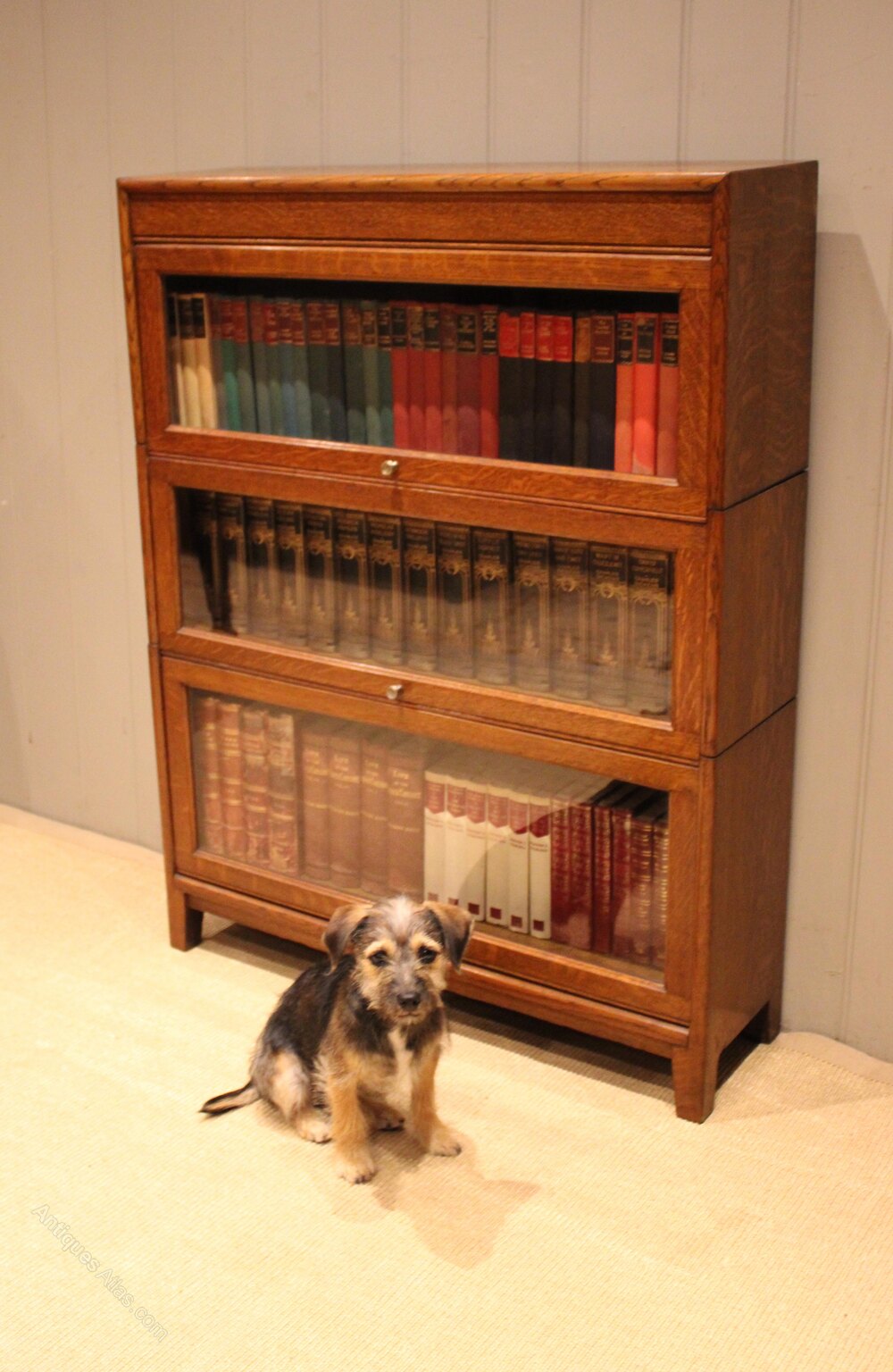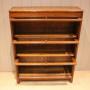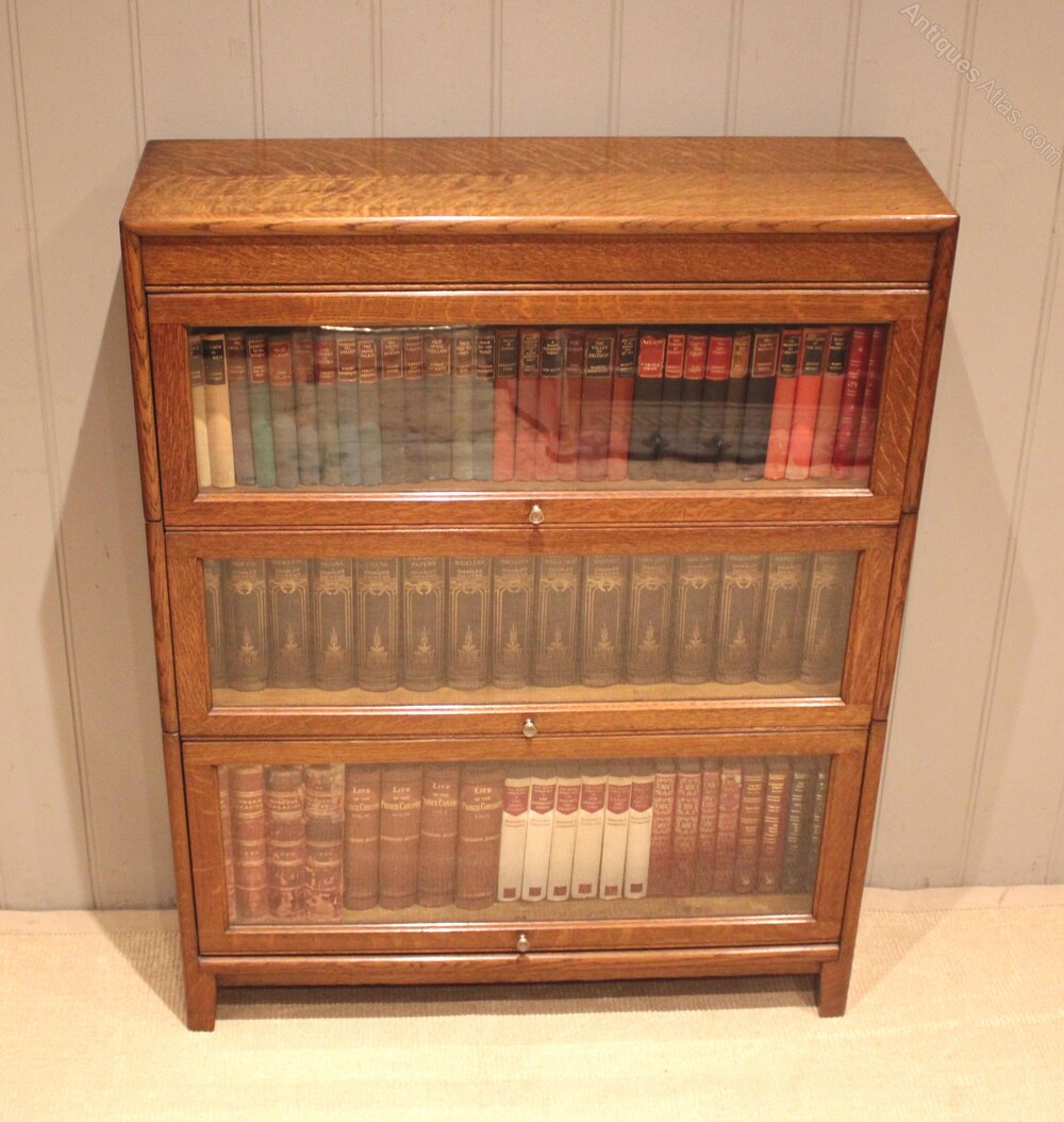 1930s oak stacking bookcase having three tiers with glazed up and over doors , raised on short straight feet.