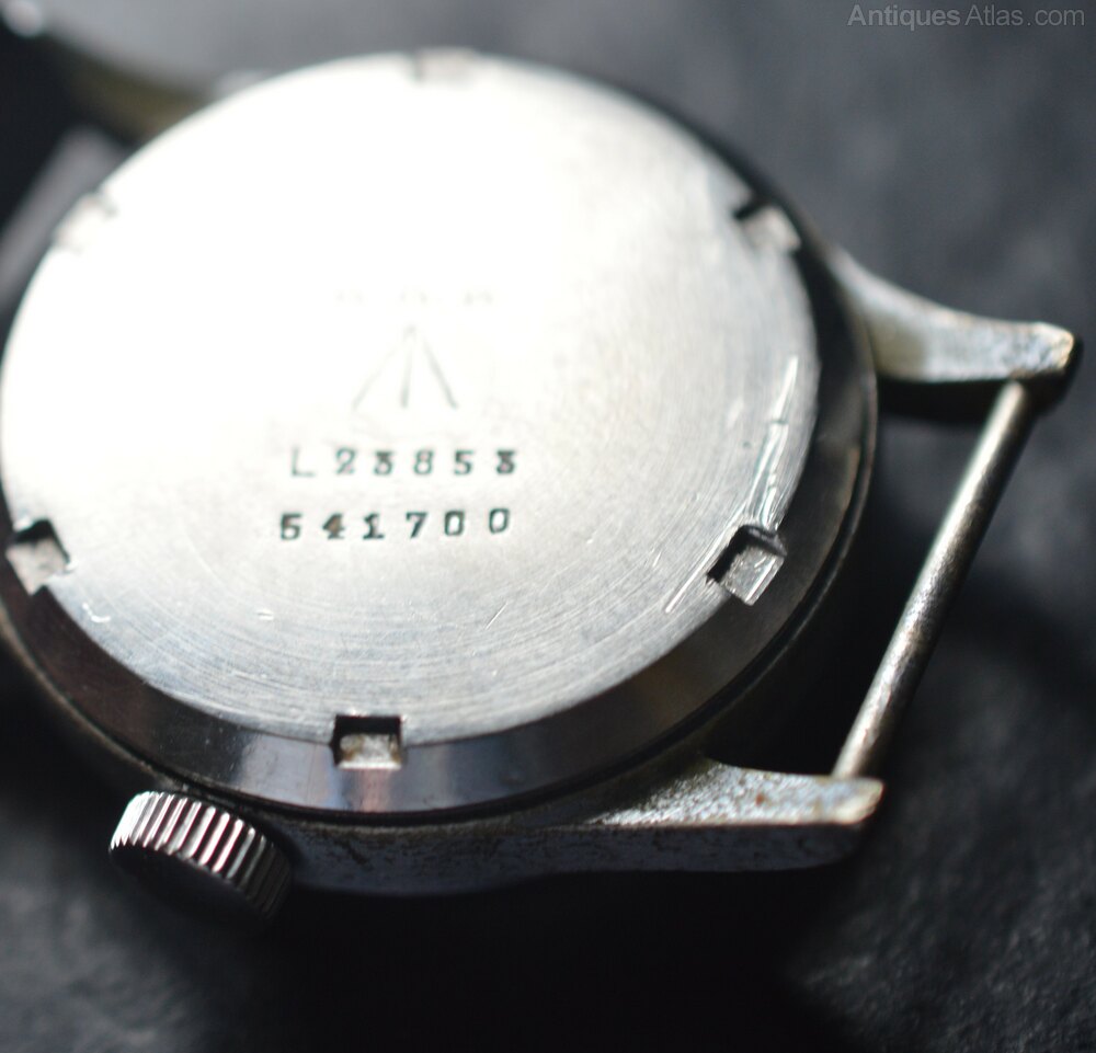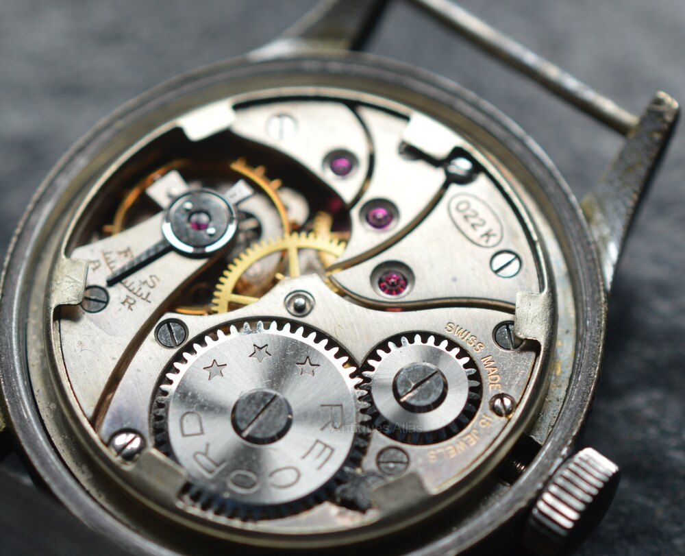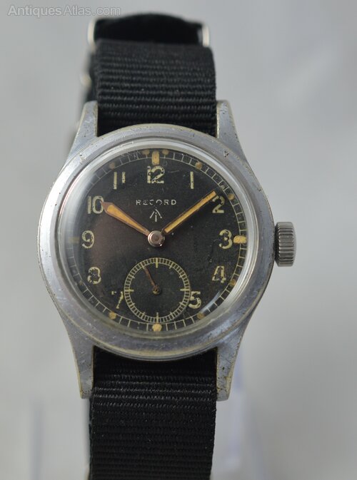 A Record 'Dirty Dozen' British Military issue wristwatch. A black dial with Arabic numerals and lume dot and line markers with subsidiary seconds. The case and dial are both marked with the broad arrow, signifying this watch was issued by the MOD. A 15 jewel manual wind caliber 022K mechanism signed Record. Case ref 541700, L23853. Circa 1945. The production run of these watches is estimated to be around 25000. Strap colour can be changed beige/stripy/leather.