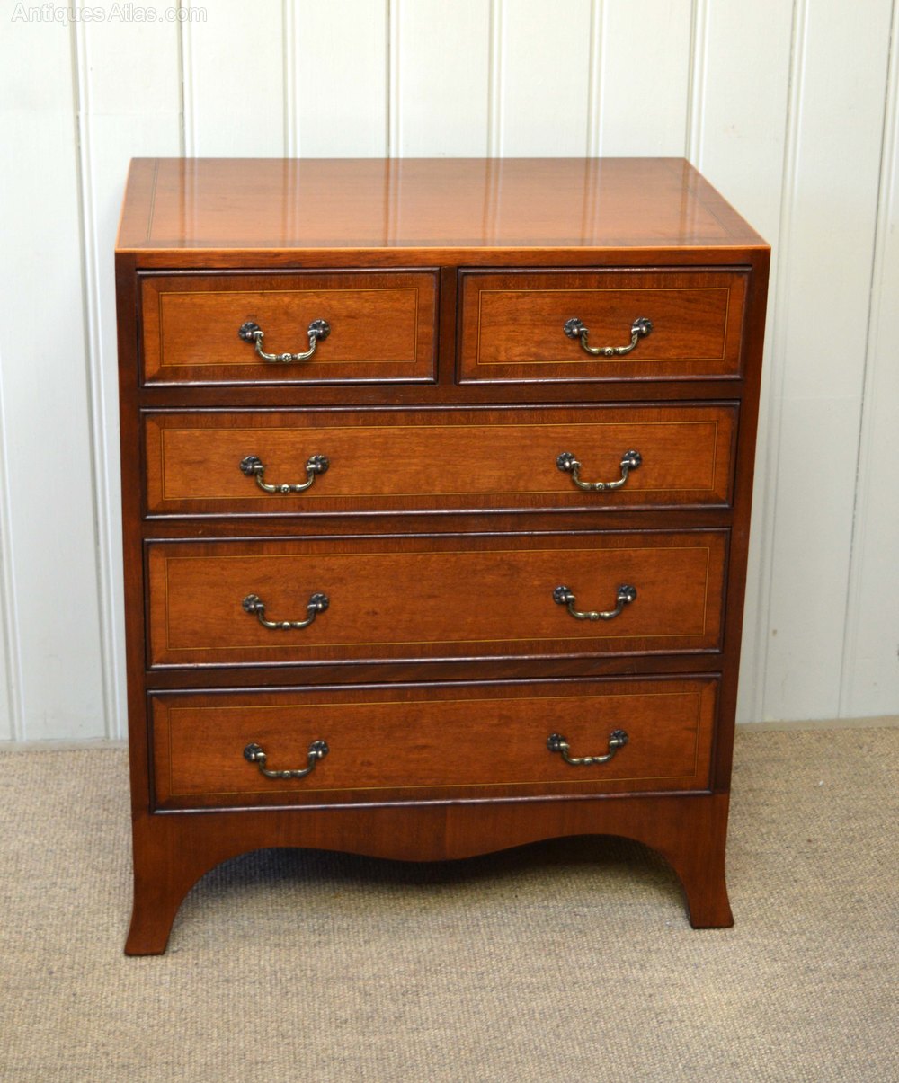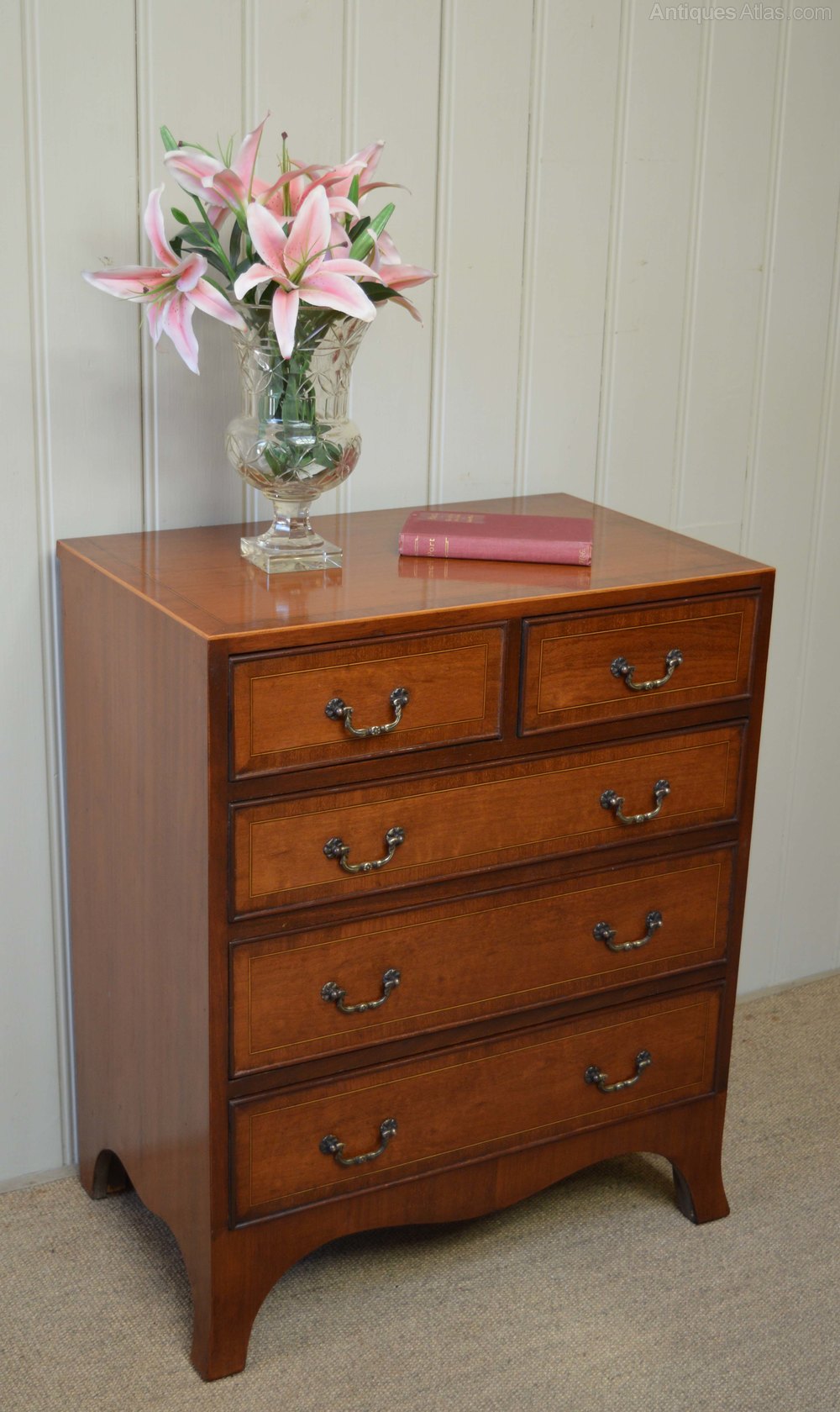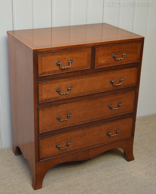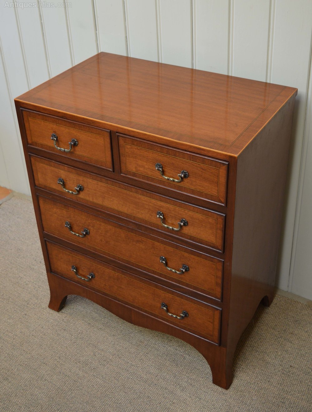 1950s Mahogany chest of two short and three long drawers having boxwood stringing supported on bracket feet