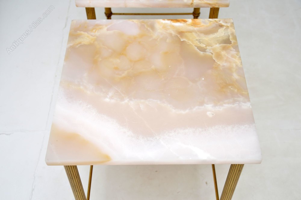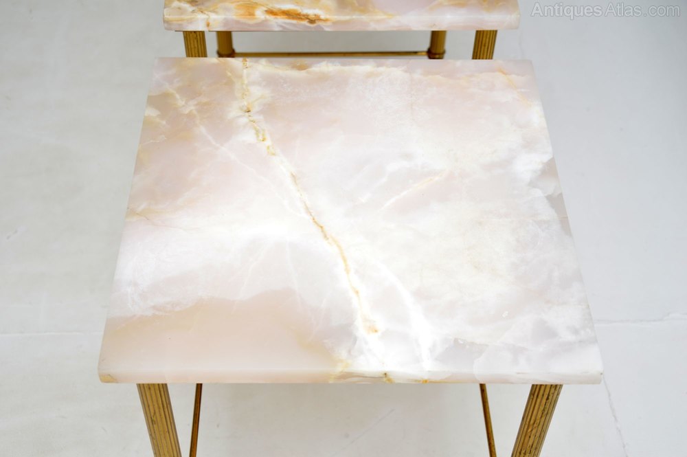 They are beautifully designed and are of superb quality. The brass frames have reeded edges and stretchered bases for extra stability. The marble tops have beautiful colours and patterns.
