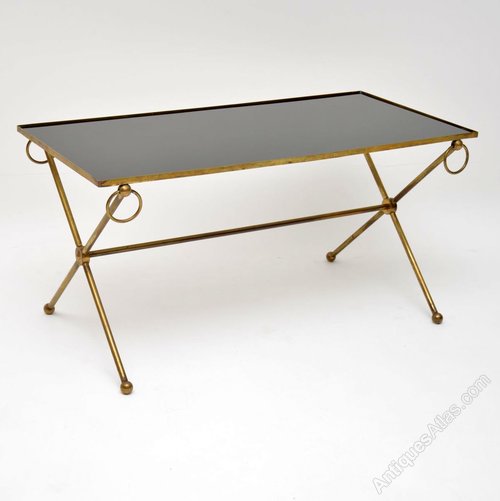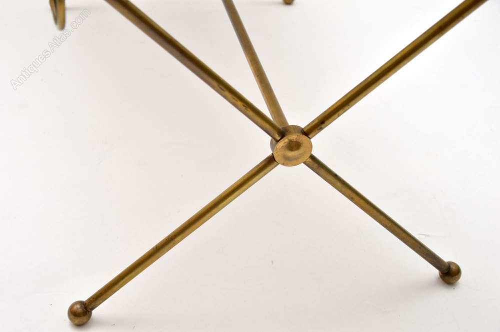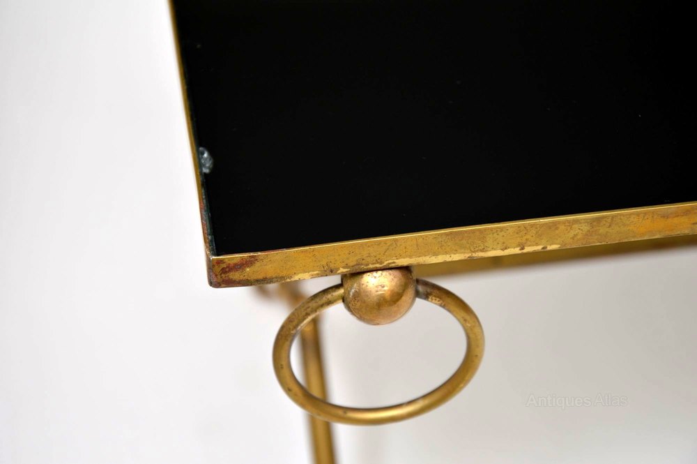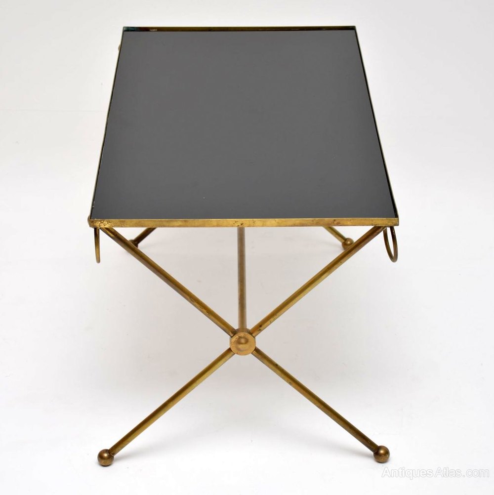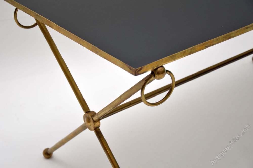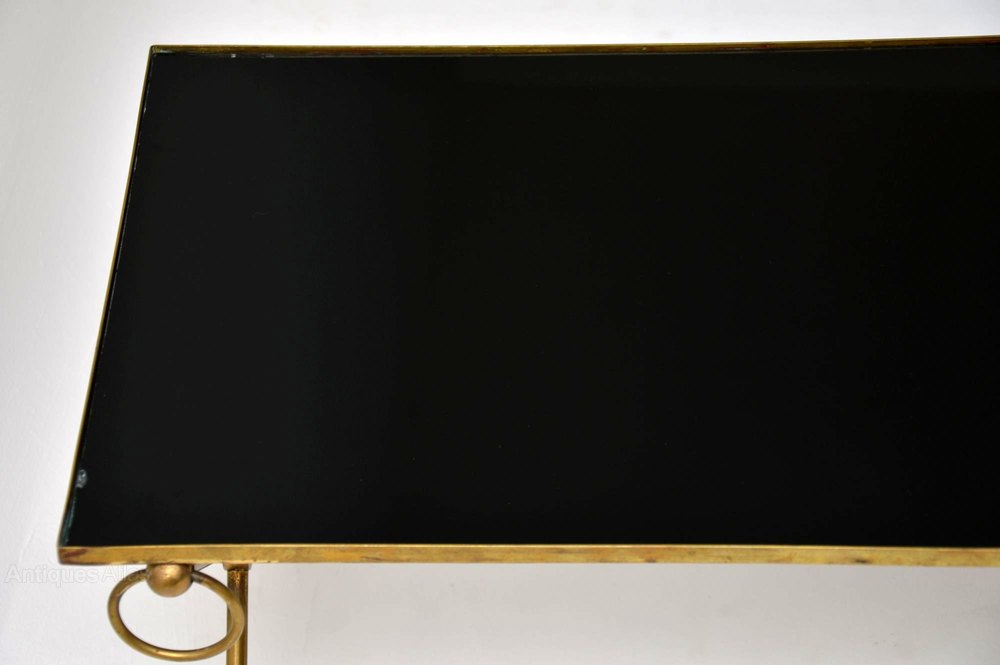 A beautiful and very well made vintage coffee table, this dates from the 1950-60’s. It has a stylish x – shaped frame in solid brass, and an inset glass top. The glass top has black backing underneath to give it that black appearance, this has worn ever so slightly on a couple of edges, seen in the images. The glass itself is in perfect condition with no chips. The brass frame has some very minor surface wear and a lovely patina.