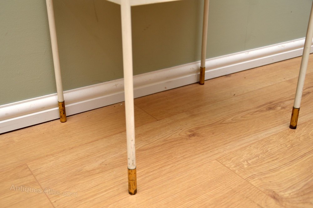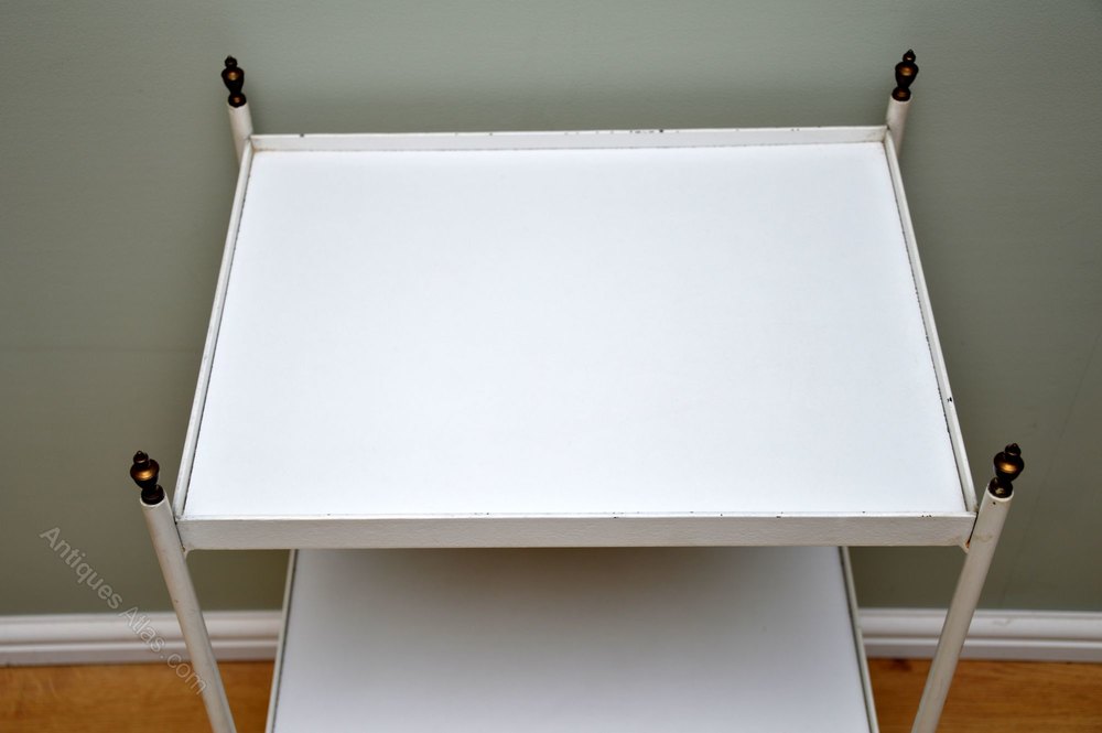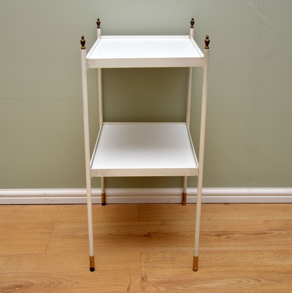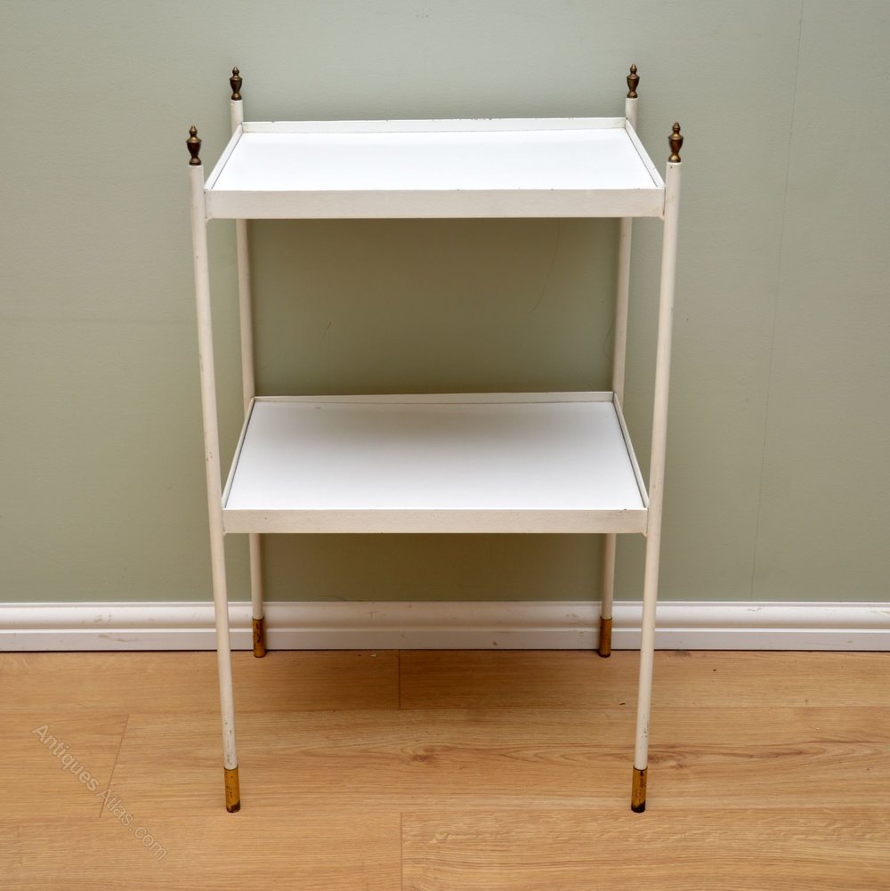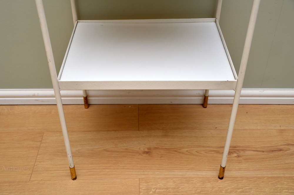 This has a painted white steel frame, with brass finials and feet caps. The shelves are wood with white formica tops.