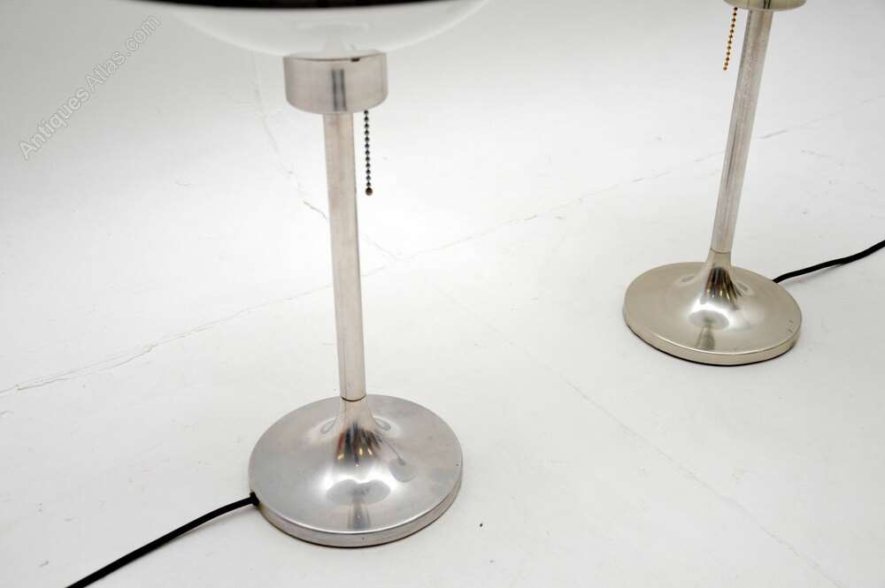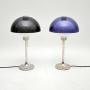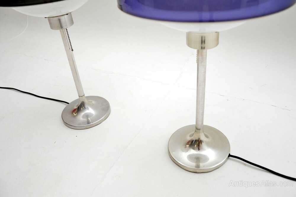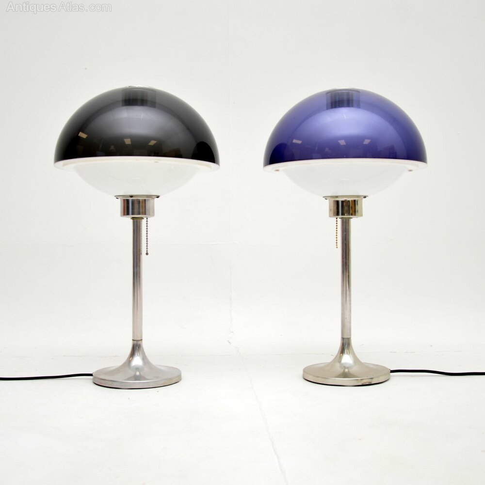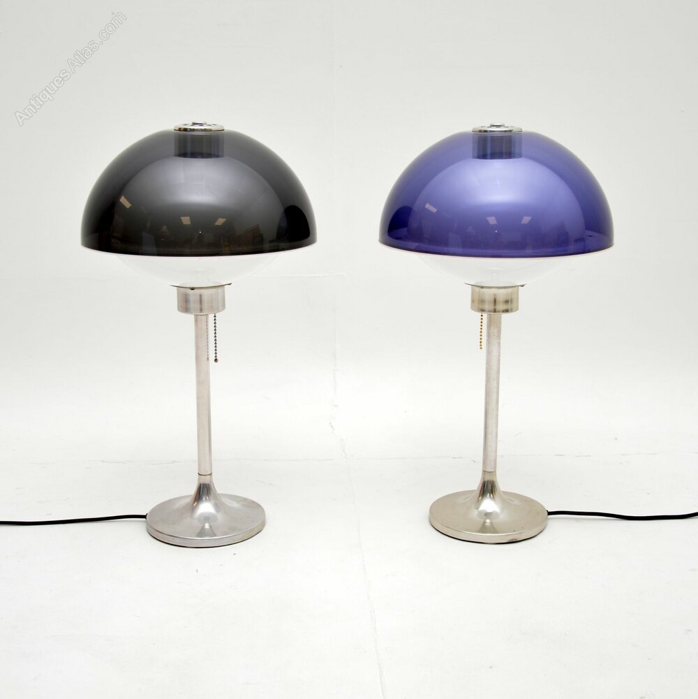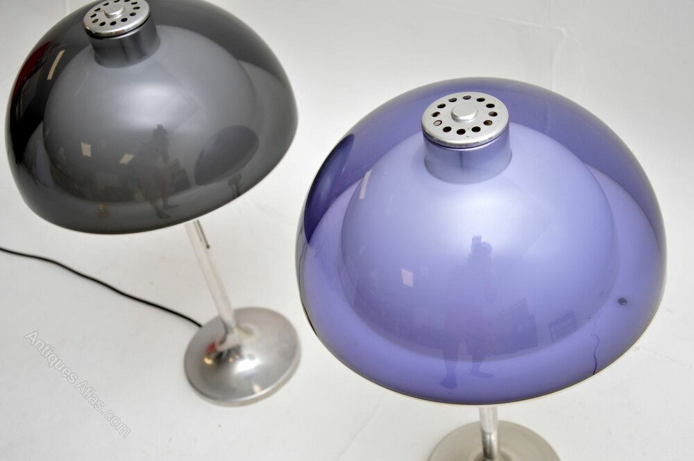 They have a fantastic space age design, with beautiful tinted plastic domed shades, sitting on steel tulip bases. One has a blueish coloured shade, one has a smoky dark grey shade. When lit up the white plastic interior glows in the form of an orb, they look incredibly cool.