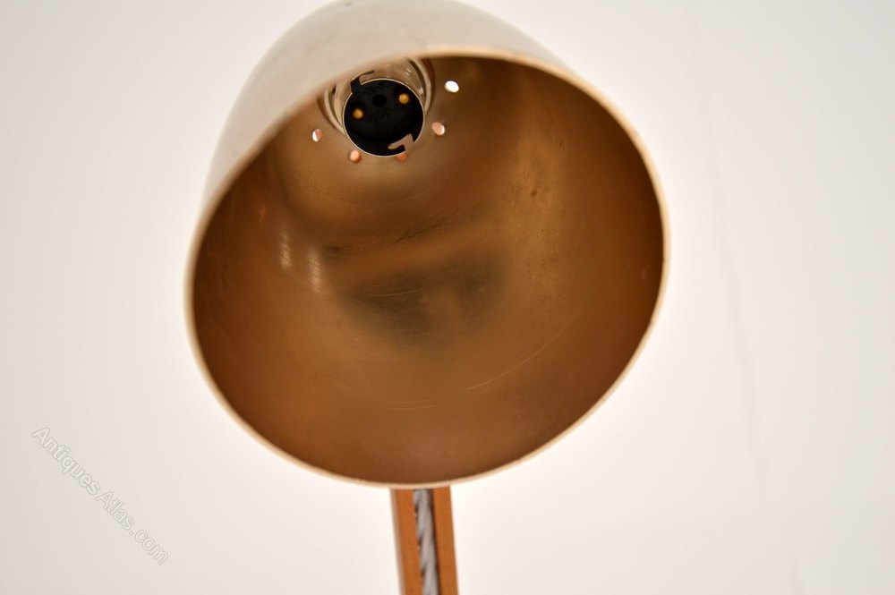 One of the nicest examples you can find, this is an early model dating from the early 1960’s, with a wooden frame. The shade and base are polished steel, with a copper support.