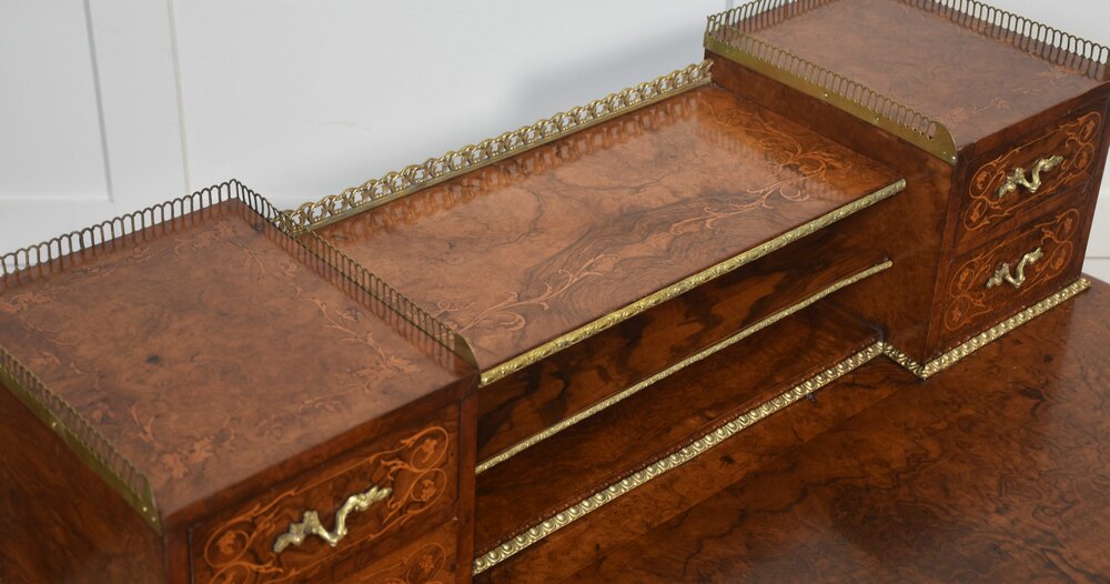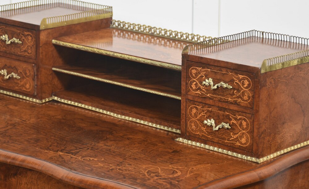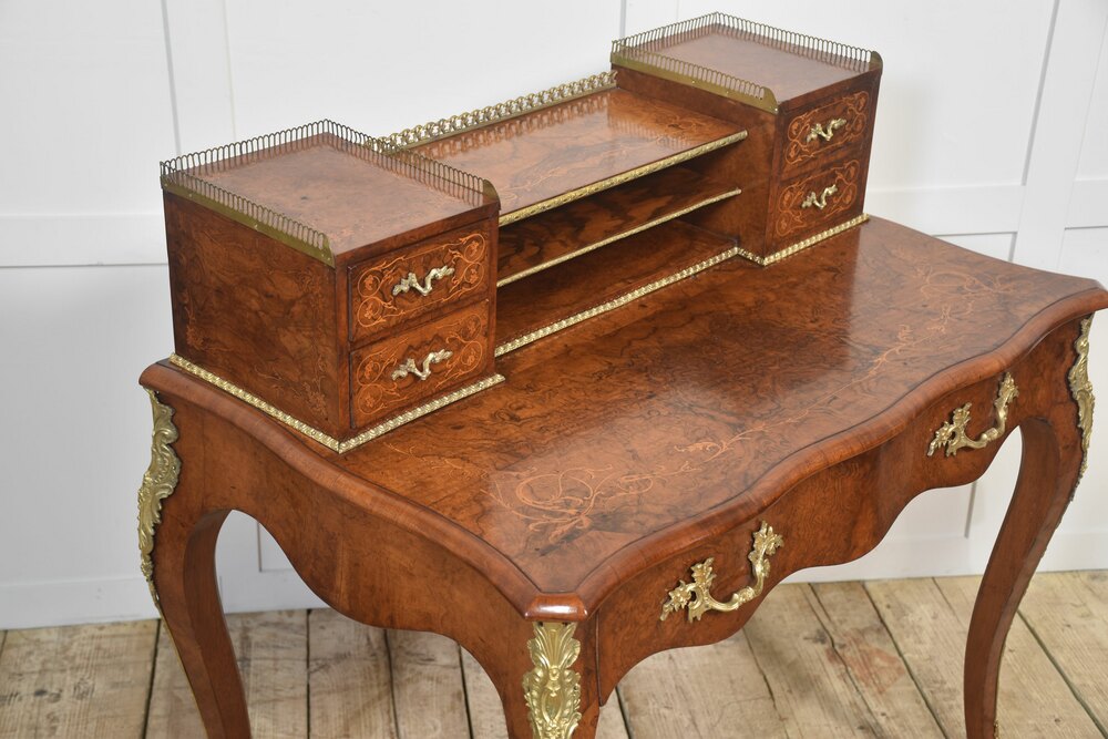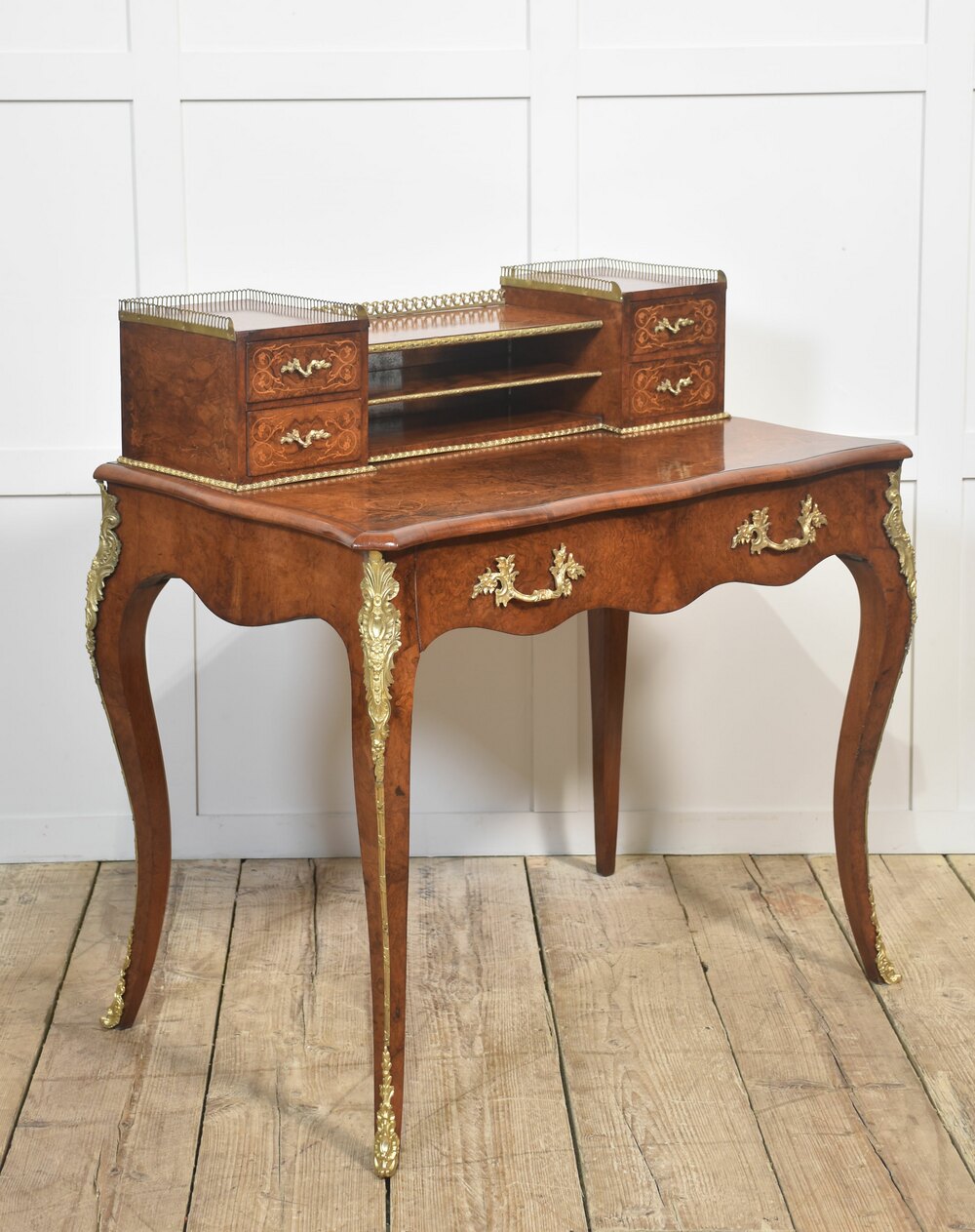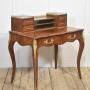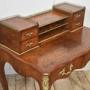 The shaped top is surmounted by a superstructure fitted with four small drawers and letter racks, framed with pierced brass galleries. The serpentine frieze contains a single long drawer, offering practical storage while preserving graceful proportions. Standing on slender cabriole legs adorned with gilt-bronze chutes and sabots, this desk exudes refinement from every angle.