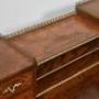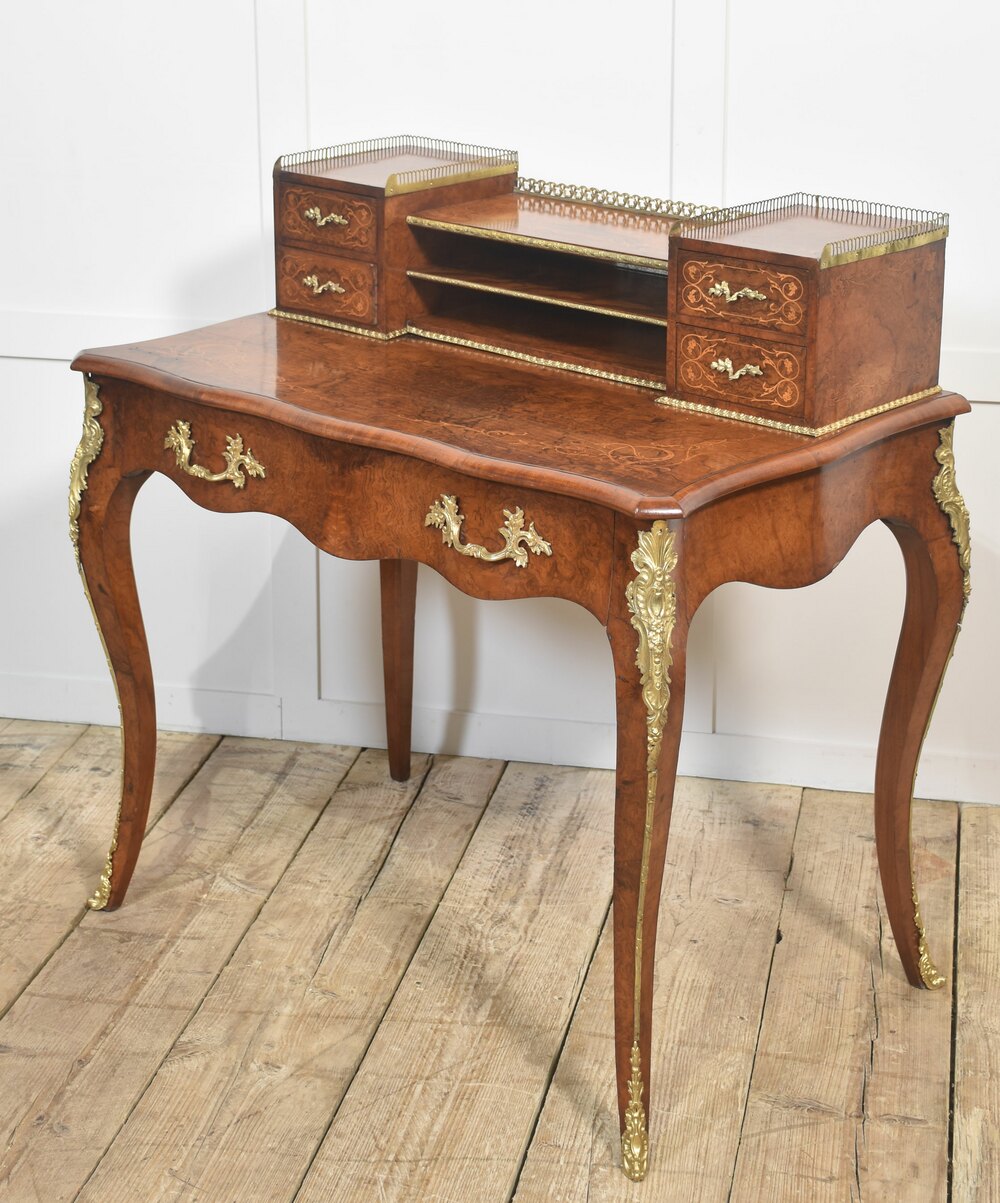 This exquisite 19th-century French writing desk, or bureau de dame, showcases the elegance and craftsmanship of the Louis XV style. The desk features a finely figured burr walnut veneer with delicate floral marquetry inlay, accentuated by ornate gilt-bronze mounts and escutcheons.