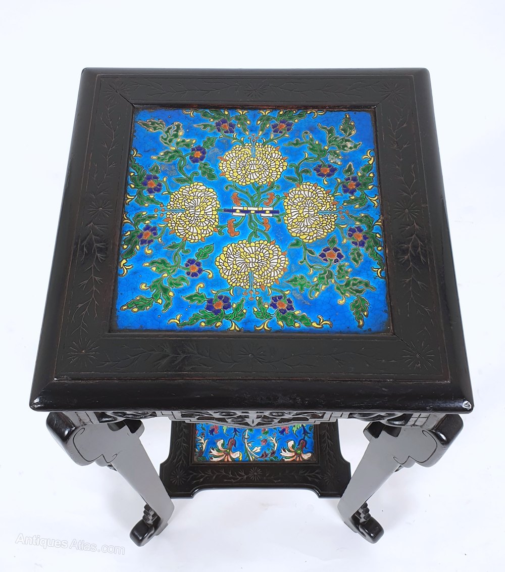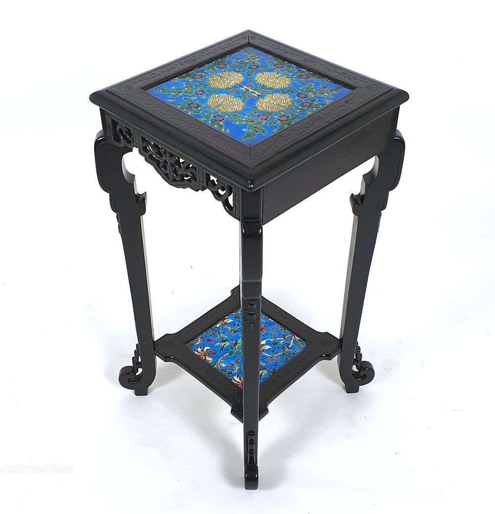This stunning and quite striking 19th C. French ‘Japanais’ ebonised carved 2 tiered stand is inset with 2 brilliant blue floral Longwy pottery tiles. It measures 14 ½ in – 36.8 cm square and 28 ¾ in – 73 cm in height. The brilliance of the blue in the tiles is true to the photos, and they have no damage, cracks or repairs. This unit would make a unique and show stopping addition to a large array of rooms and design settings, both contemporary and traditional as well as minimalist.