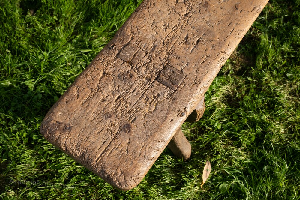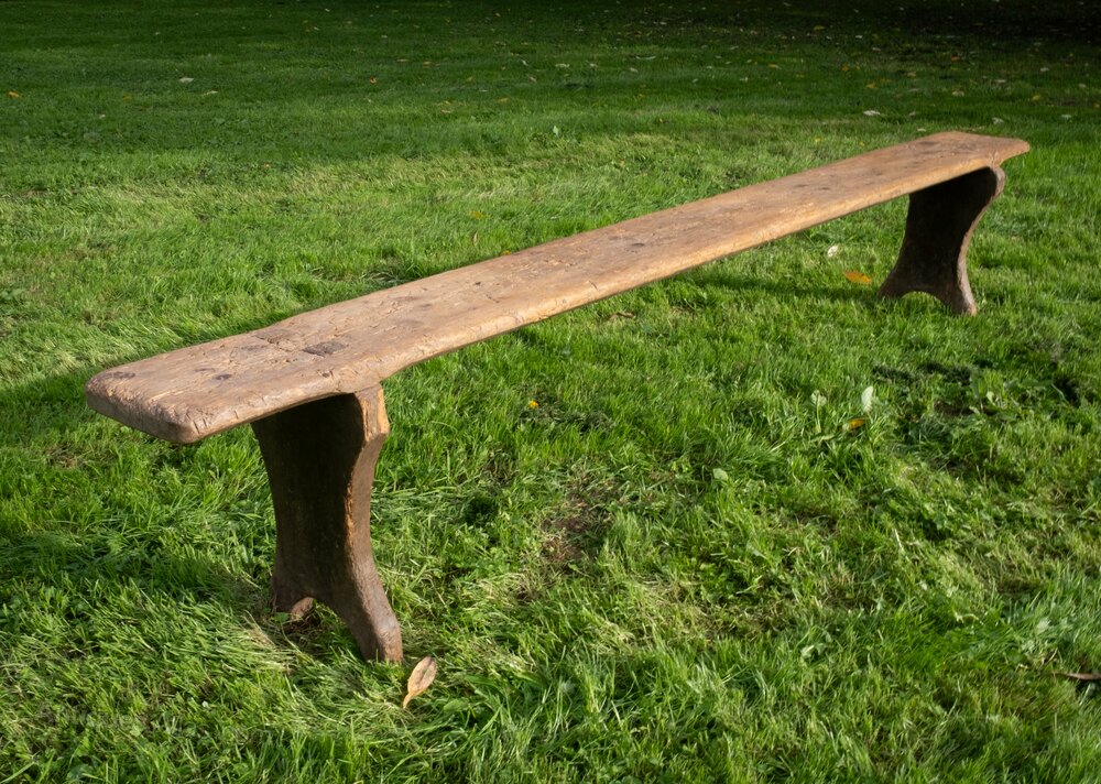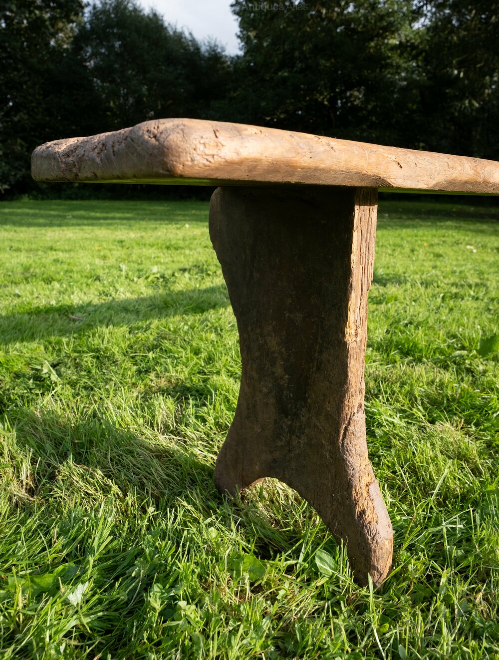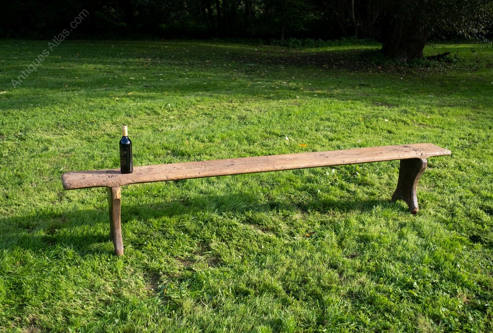 The nine-foot long single plank top has an incredible patina and sits firmly upon two solid shaped legs, each formed of a single plank. One of the leg planks has a loss to one side (please see photographs). The pegged construction remains strong with no movement in the joints at all.