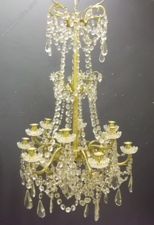 Ref 2548 - Good quality 19th Century, 12 arm over two tiers bright brass Napoleon III chandelier with clear crystals. One professionally repaired arm. Not wired, originally lit by gas.