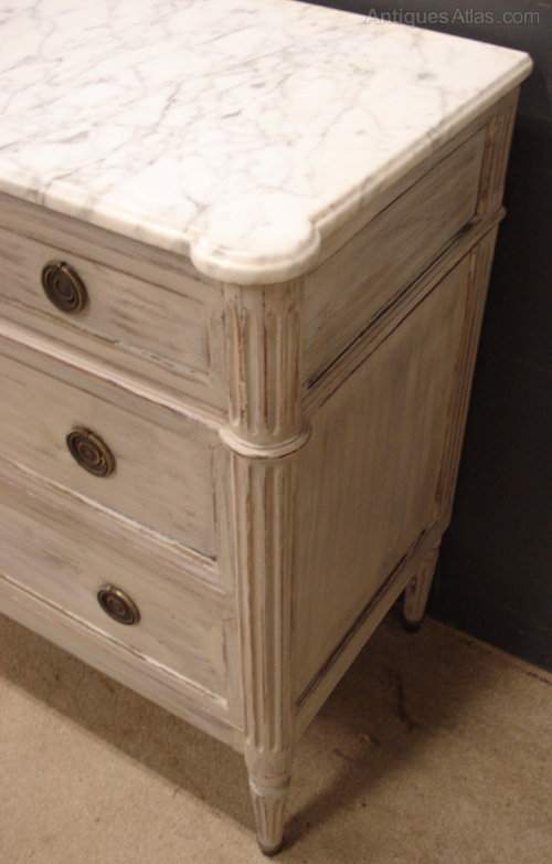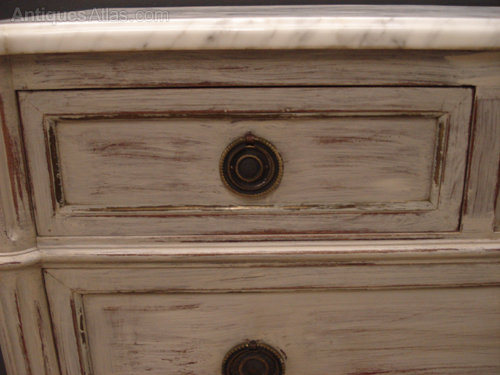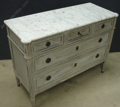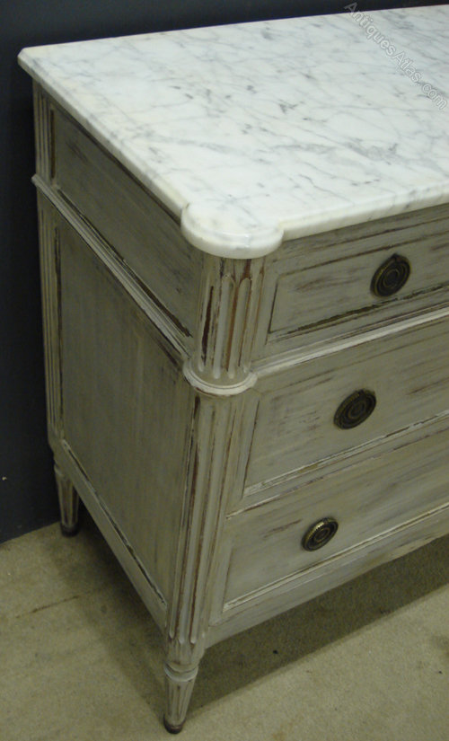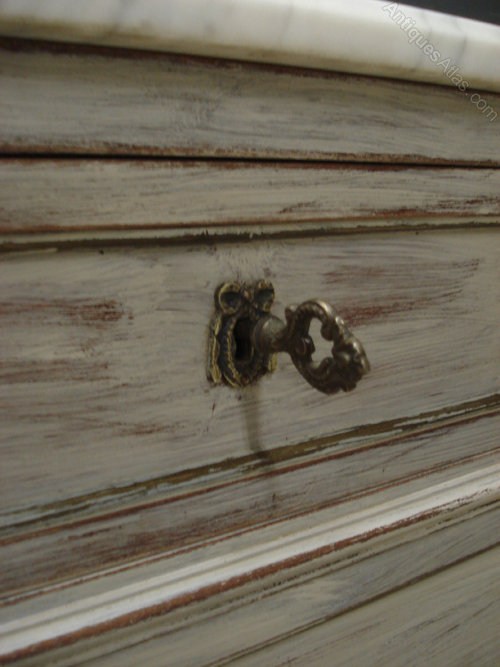 Ref 4128 - 19th Century French Louis XVI style distressed painted marble top commode. Three short drawers over two long drawers. Oak lined. Original brass fittings. Circa 1890.