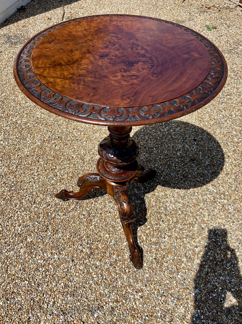 Beautiful mid Victorian burr walnut wine table. Hand carved base and top. Lovely colour and in good condition for age.