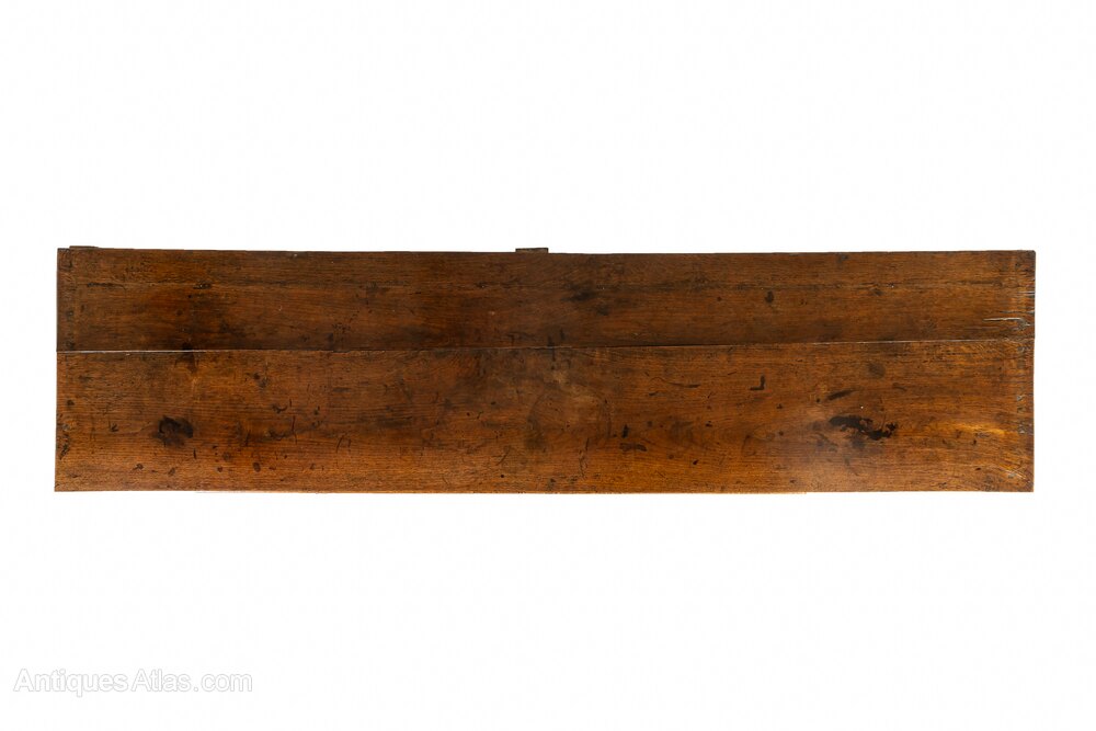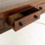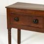 With three deep drawers and a planked top, this piece is of conventional form. The front legs are turned, contrasting with the plain square legs at the back. Each of the cockbeaded drawers has a turned handle of large scale. The timber used throughout is of fine rich colour with a good patination and attractive figuring. The sides of the piece are panelled.