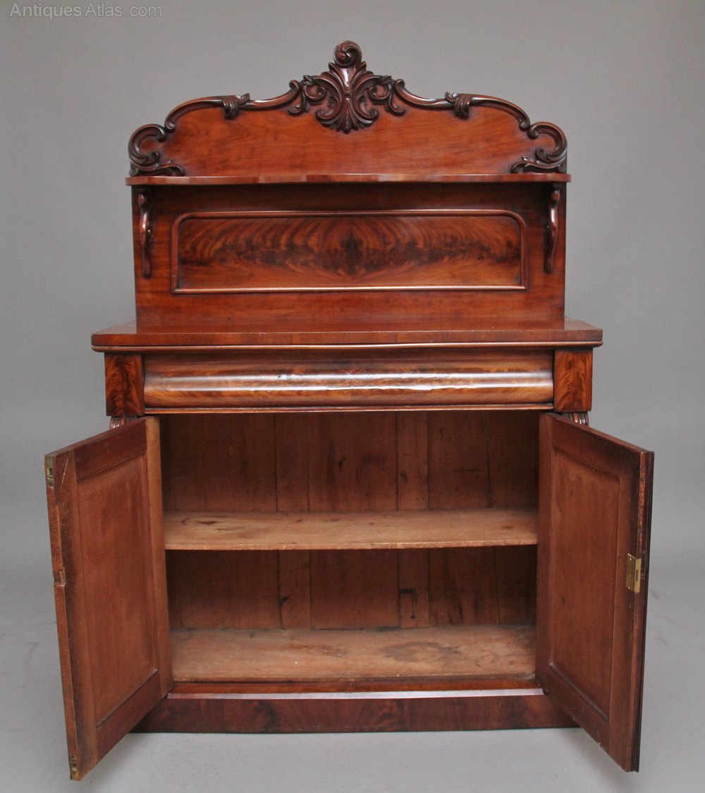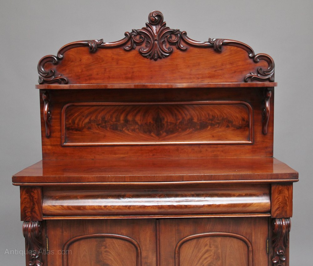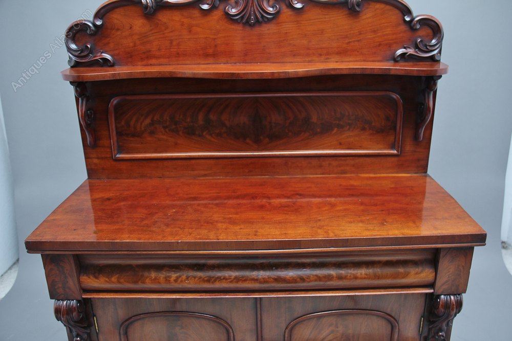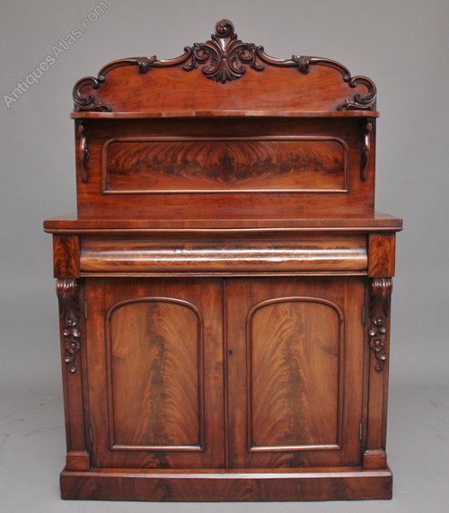 19th Century flame mahogany chiffonier cabinet, having a shaped and moulded carved scrolled pediment above a shaped shelf with a flame mahogany panel below, the base having single mahogany lined frieze drawer above two flame mahogany panelled doors opening to reveal a single shelf inside, the doors flanked by pillars with carved leaf decoration, standing on a plinth base. Circa 1840.