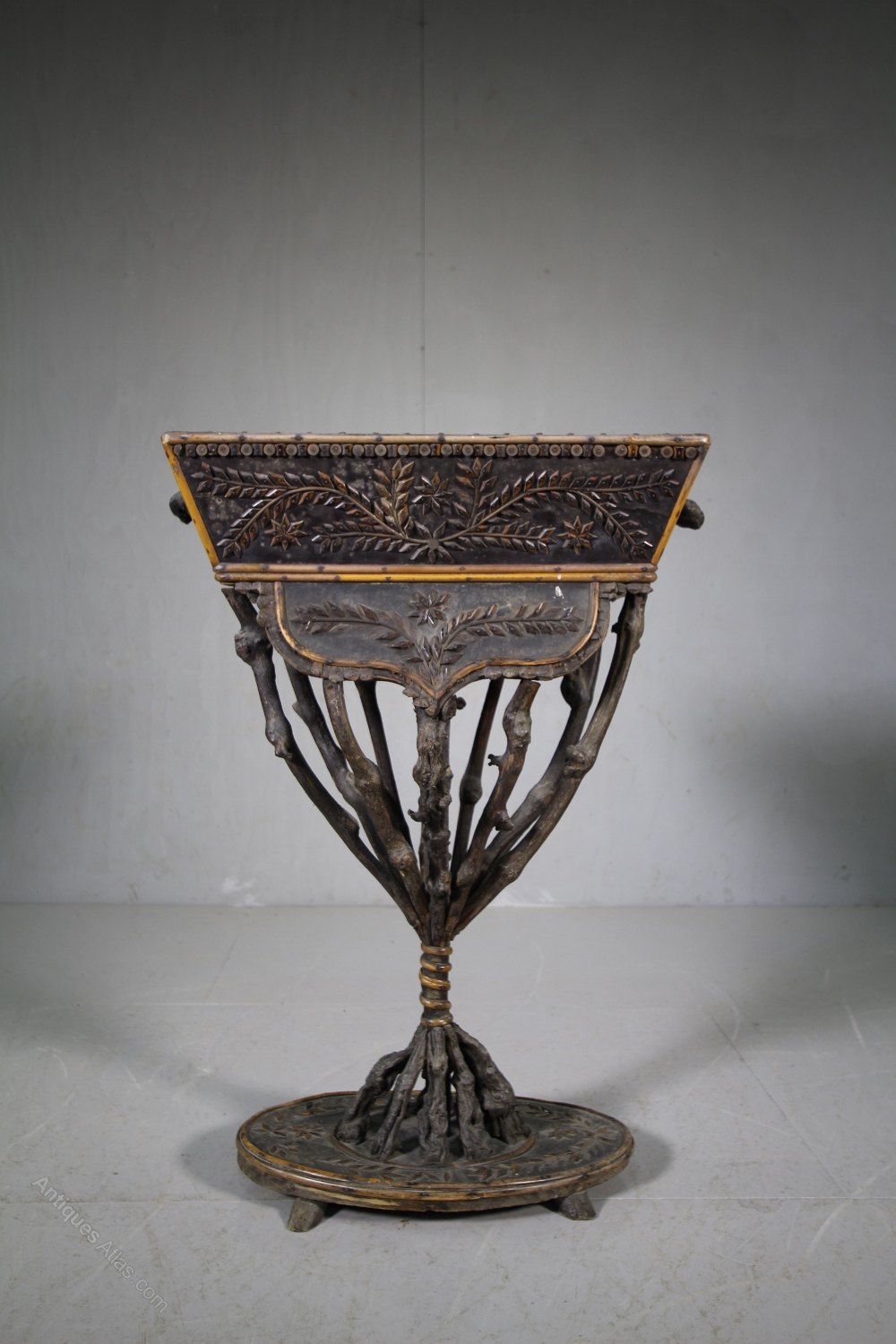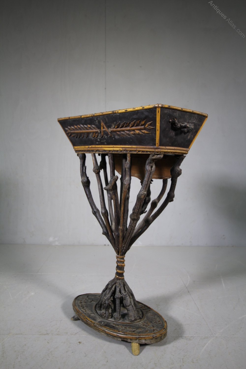 This is a beautiful, French antique twig work jardiniere stand, an amazing survivor, as all the rustic applied decoration sare intact. In very good, strong condition, a very decorative rustic 19th century antique jardinere stand.