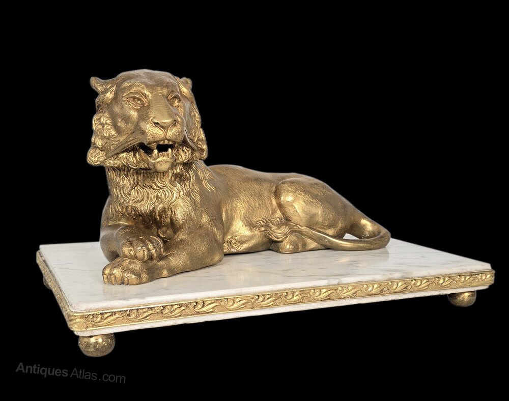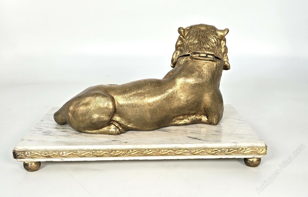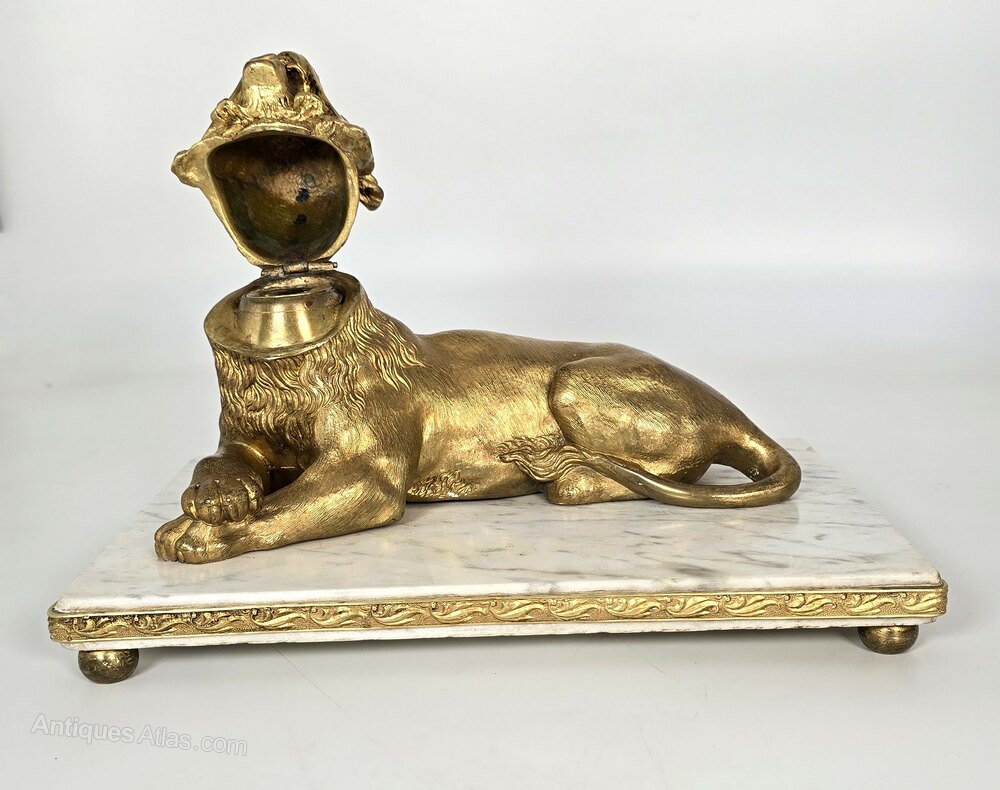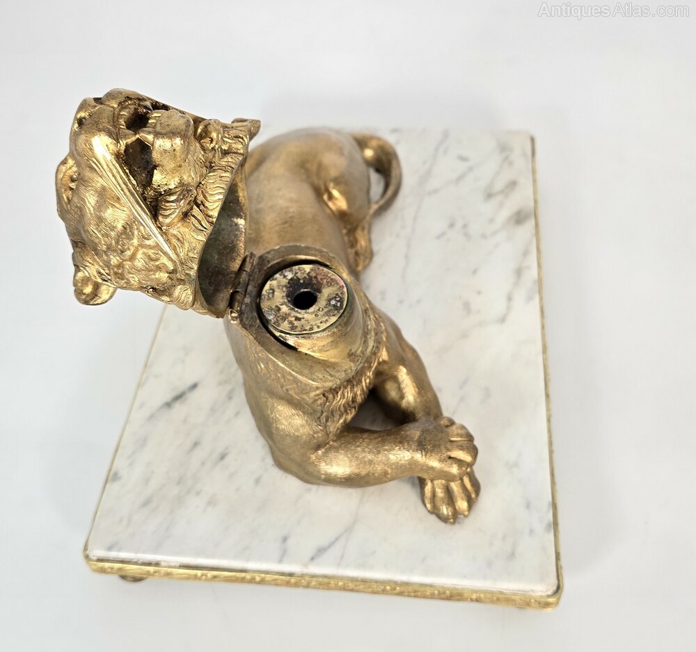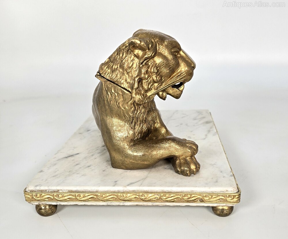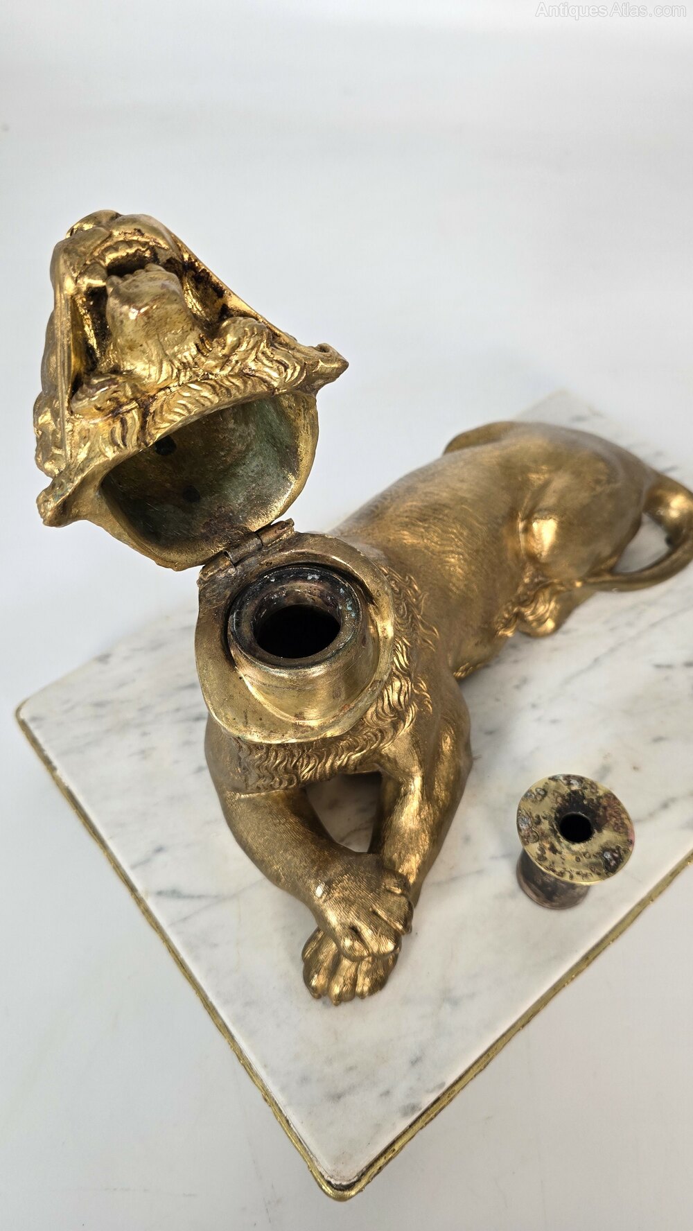 19th Century Gilt Bronze And Marble Lion Inkstand.
