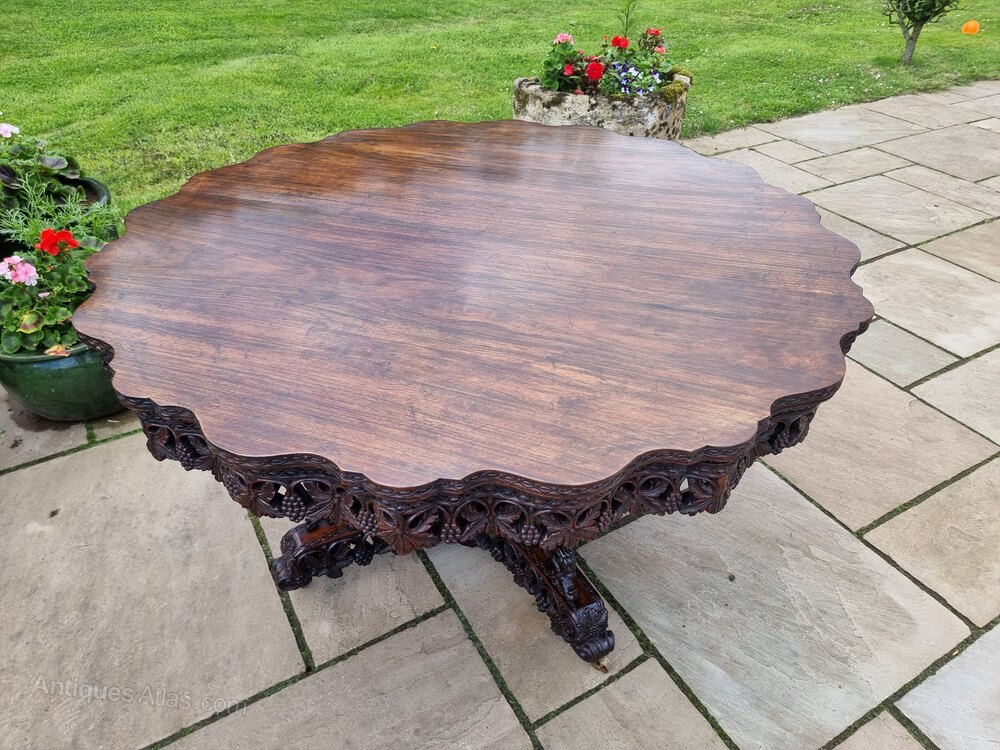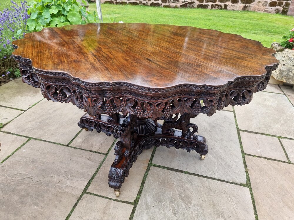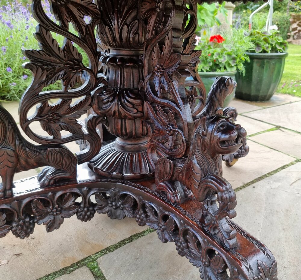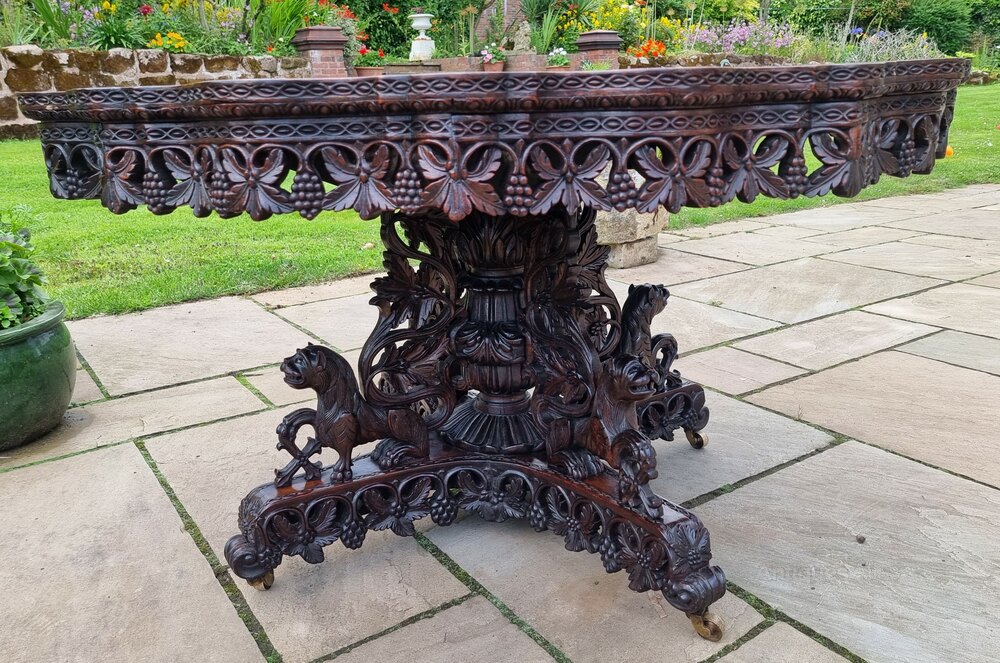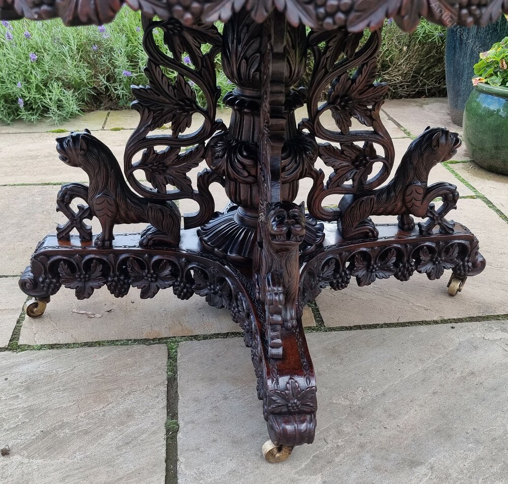 This most elaborate and grand Indian Raj period centre or breakfast table is larger than most other examples. It is made from dense heavy padauk wood which is native to India.