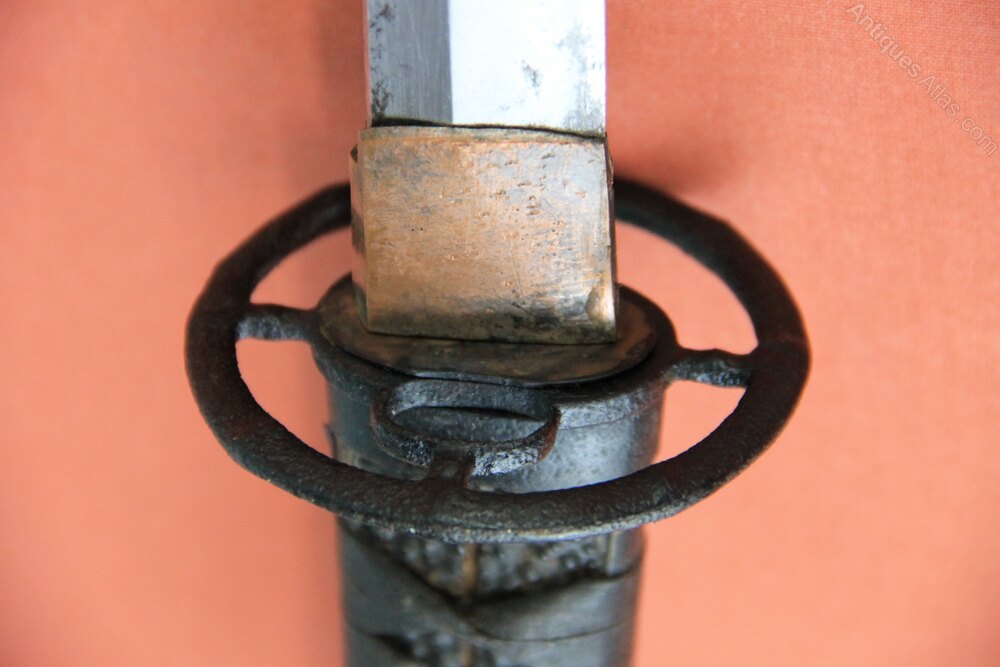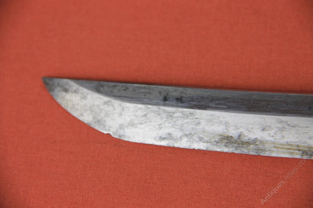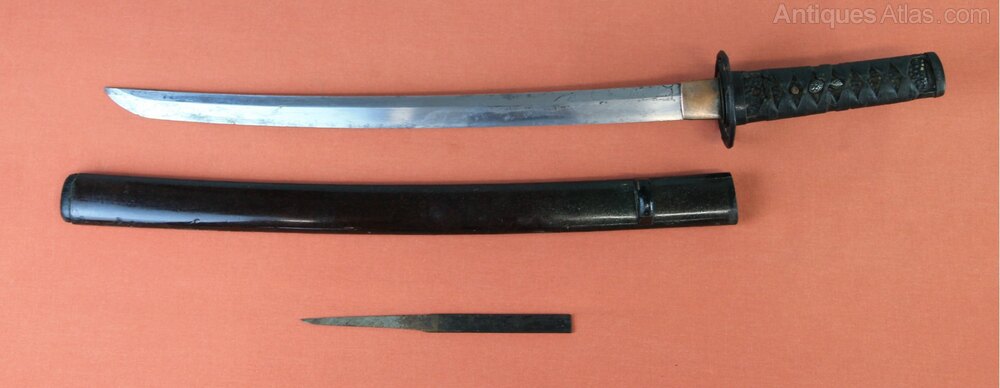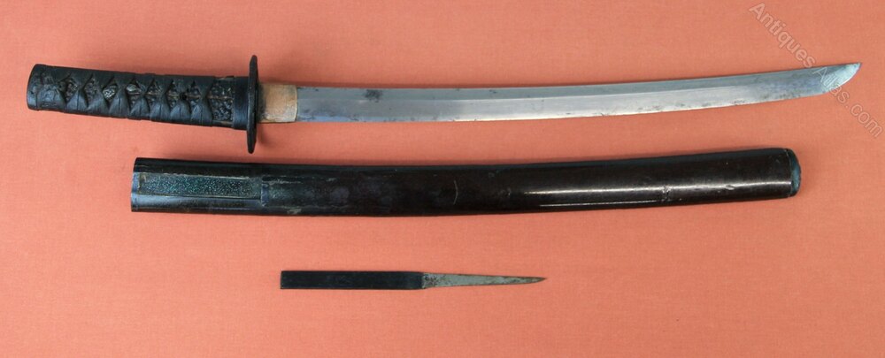 19th century Japanese Wakizashi short sword in its original speckled lacquer scabbard. Has a cord bound hilt over a fish skin grip with two silver menuki ornaments. Has plain iron mounts with pierced Tsuba guard. There is a single edged tapering blade with some rust staining and some original finish. Also there is a plain iron kozuka fitted to the scabbard. There are some areas of heavy wear overall and two edge nicks to blade. Tang has one hole but is not signed. Please note the Tsuba is loose on the tang.