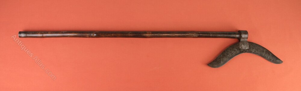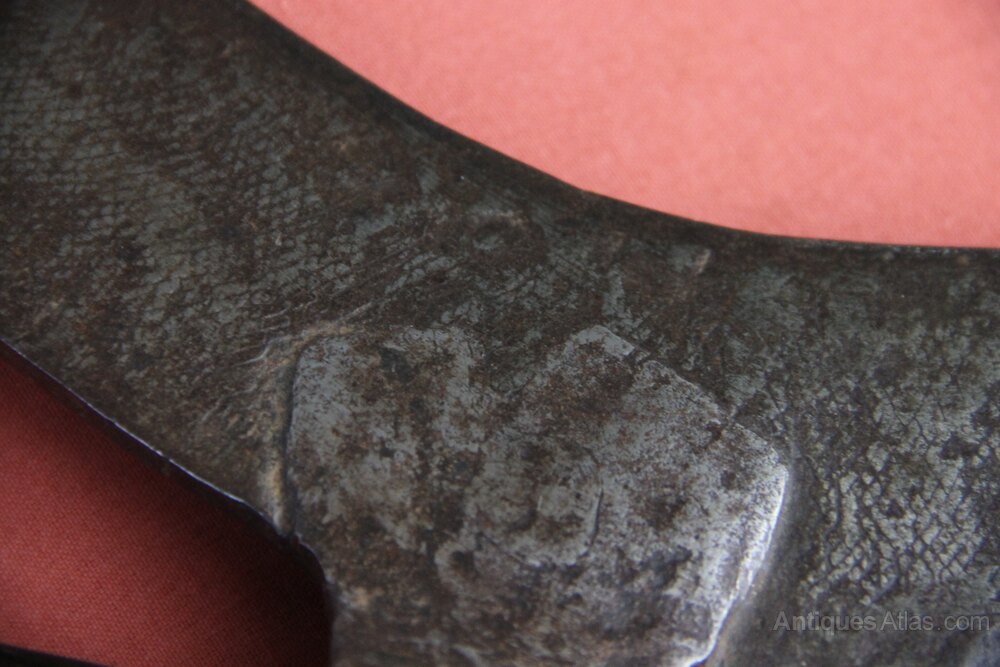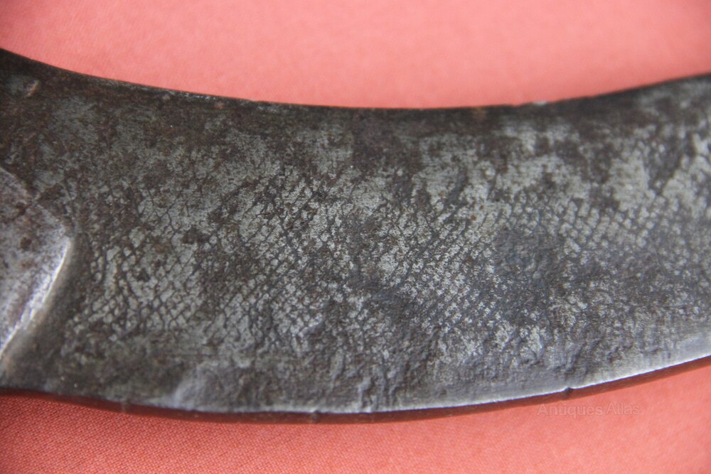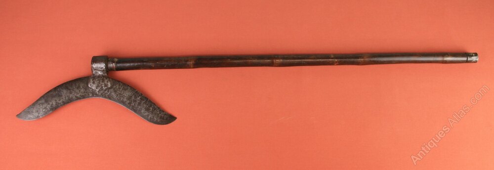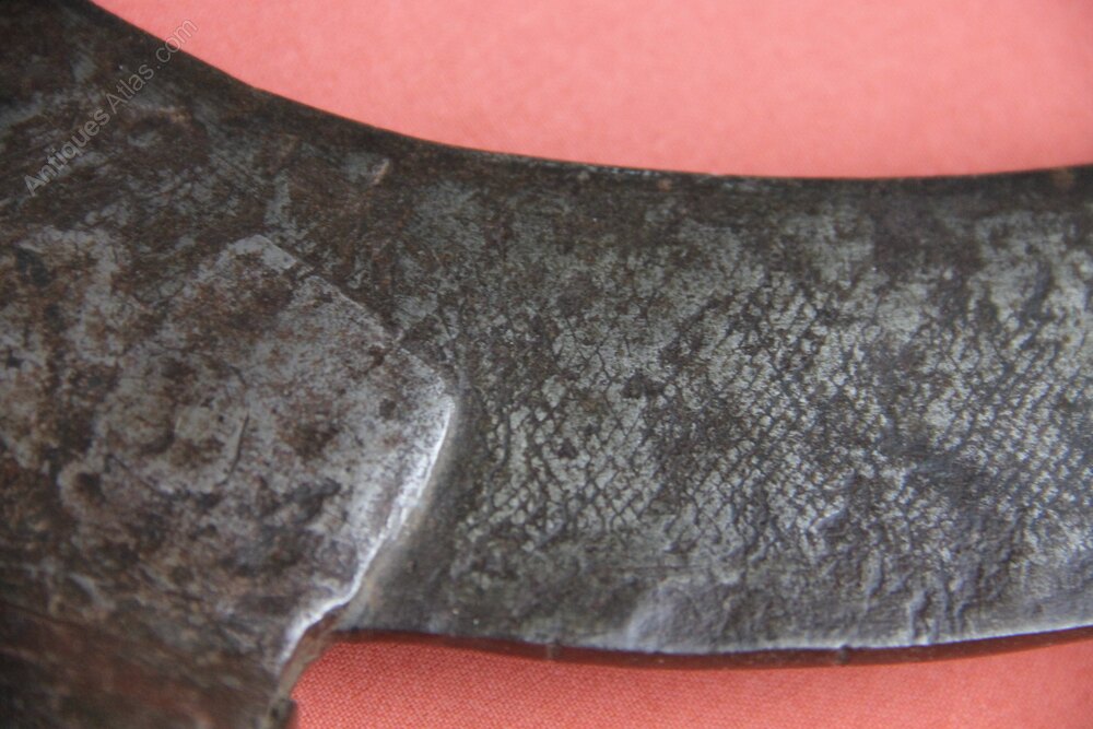 19th century large Bulova Indian axe. Has a curved moustache shaped blade on a bamboo haft. Blade has cross hatch line decoration on both sides. Axe is in good solid condition with heavy overall patena.