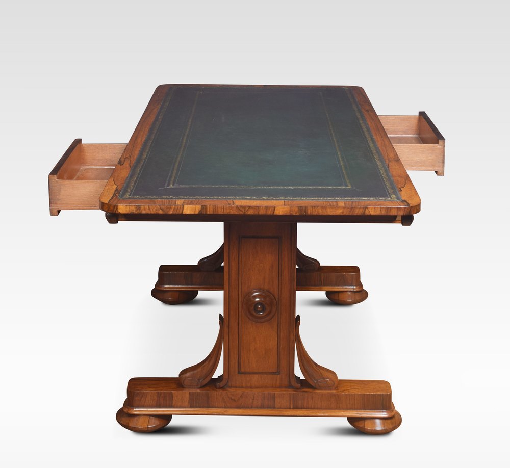 19th Century rosewood library table, the large rectangular top with rounded corners having tooled inset leather writing surface. The frieze fitted with opposing drawers, supported on twin carved uprights, united by a turned stretcher. All raised up on bun feet.