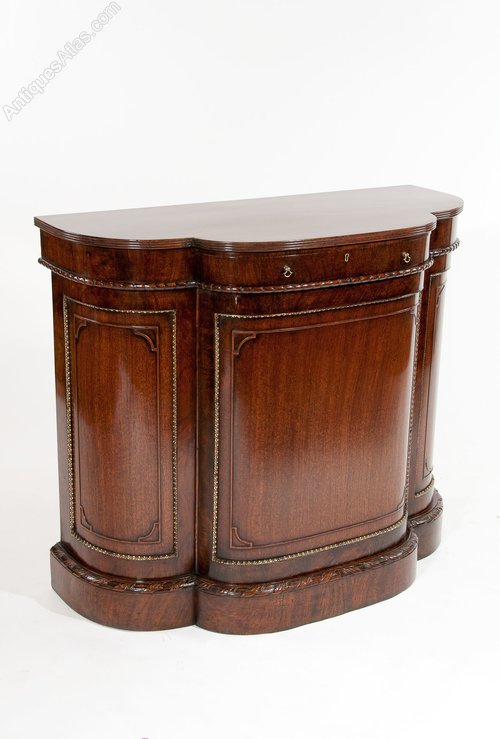 A very good quality 19th century shaped side cabinet chiffonier dating to circa 1850. This quality cabinet has a solid mahogany shaped top with a reeded edge over a long central shaped figured oak drawer with brass pulls. Beneath having three mahogany panels with burr oak surround and ormolu beading, the central panel being a shaped door which opens to reveal a shelved storage compartment with brass lock.
