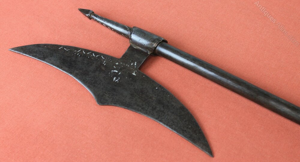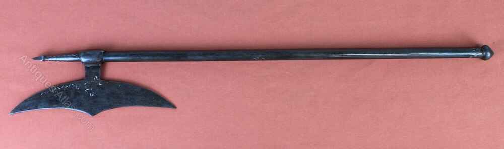 19th century steel Bulova axe. Has a crescent shaped moustache blade and a steel haft tapering to an end spike. With traces overall of silver Koftgari work. Good sound condition overall with some age wear.