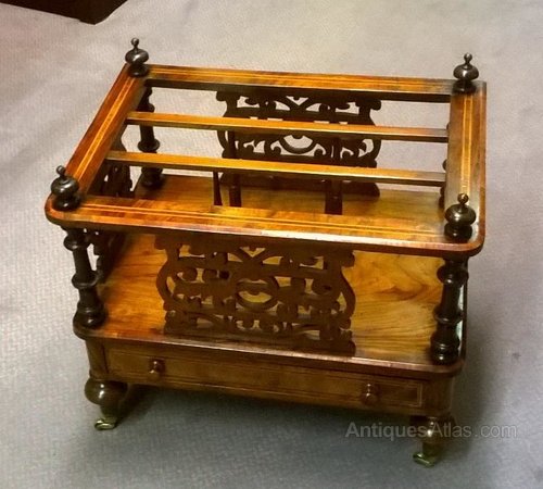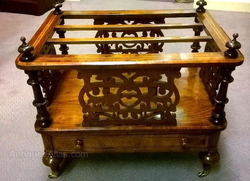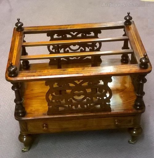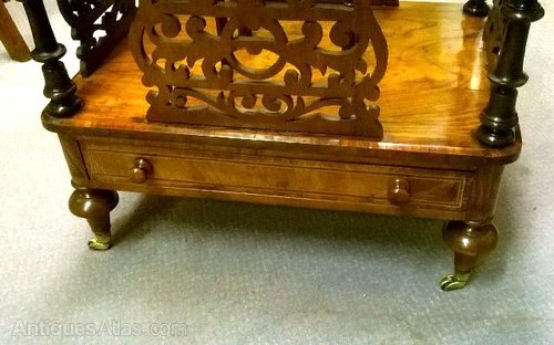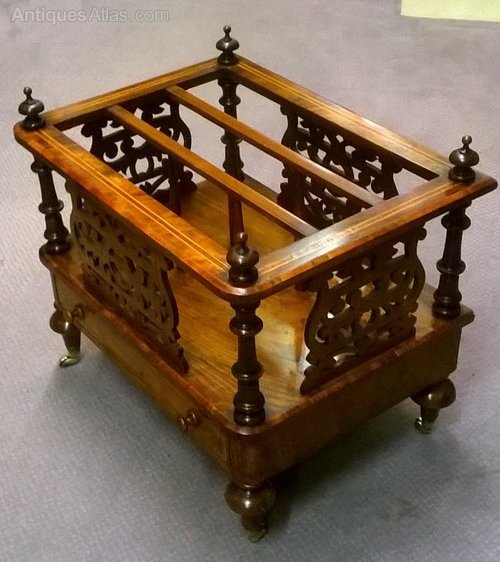 This pretty 19th century walnut canterbury has had a clean, wax and buff and is now in very tidy condition and ready to store those reading items you want to keep. Having the useful little drawer in the base it can also hide other bits and pieces you want out of the way, reading glasses and the like. The inlays are good as is the fretwork and all in all its a superb looking useful item. Could make a superb present perhaps.