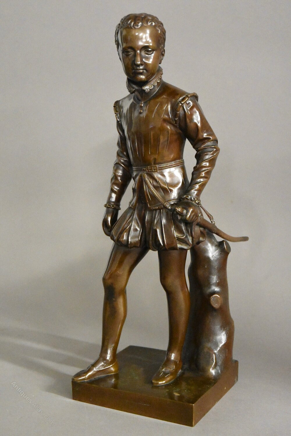 The figure of young Henry is depicted in traditional dress holding his sword in his left hand and leaning against a tree trunk.
