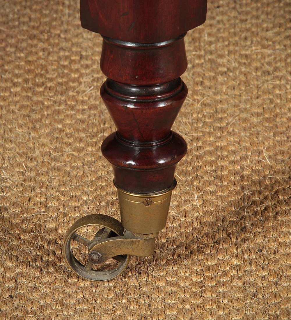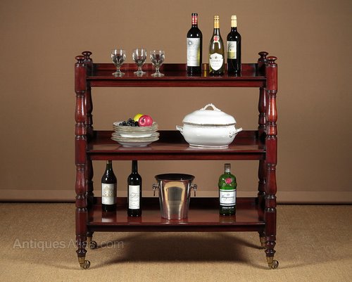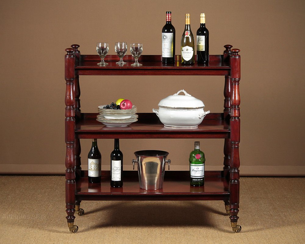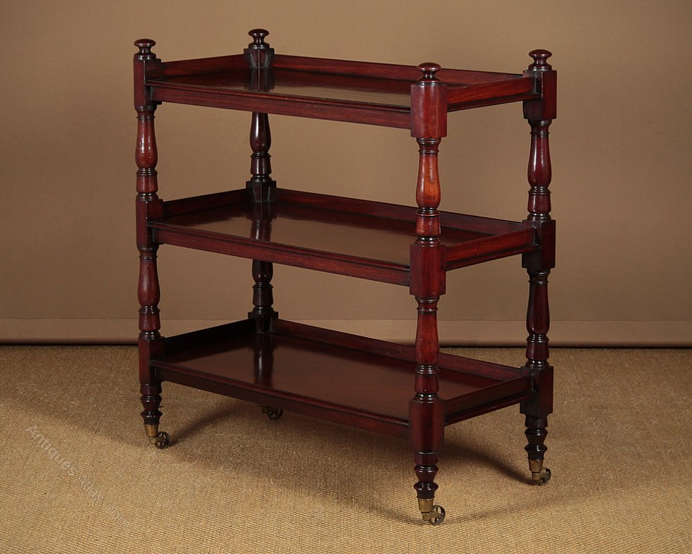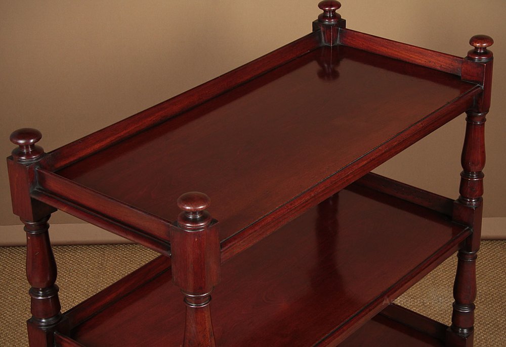 Superb quality 19th.c. mahogany buffet or whatnot, c.1870. Three shelves (height 13½”) raised on turned column supports front and rear, with original brass castors to the bottom. Single piece solid mahogany boards make up the shelves, with a molded front edge to each and a raised gallery to the rear and sides. Particularly good colour and grain, in excellent condition, cleaned and polished in our workshops.