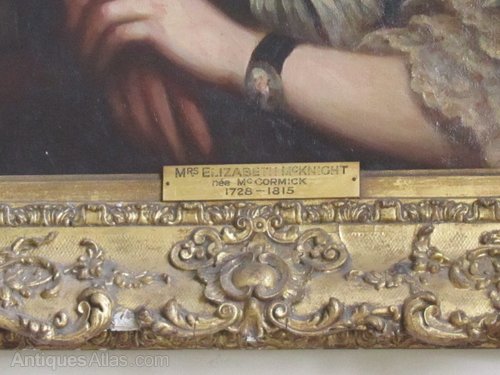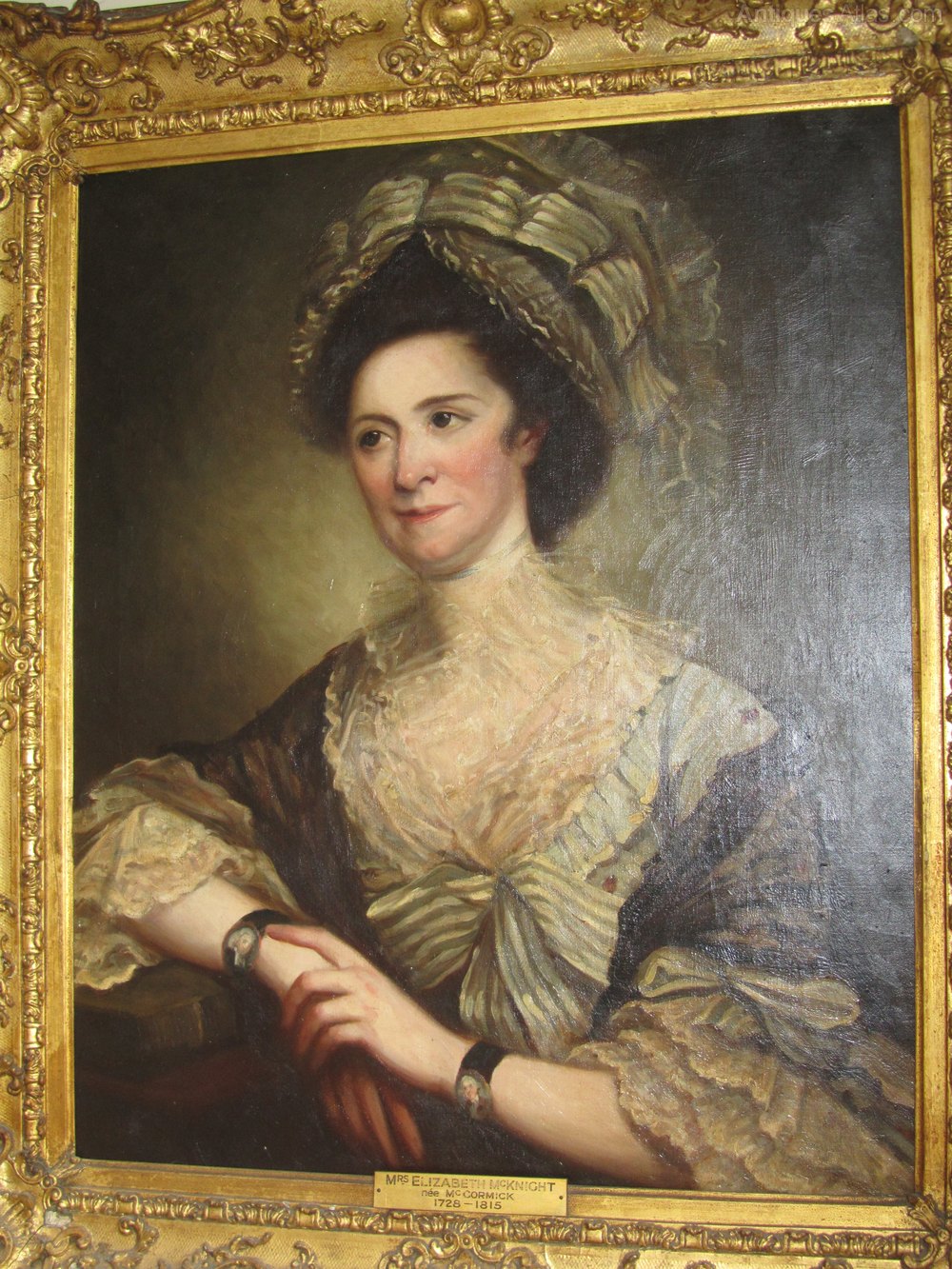 19thc portrait of Mrs Elizabeth McKnight nee McCormick, 1728-1815. Artist unknown. Oil on canvas in a composition gilded frame.