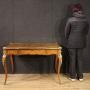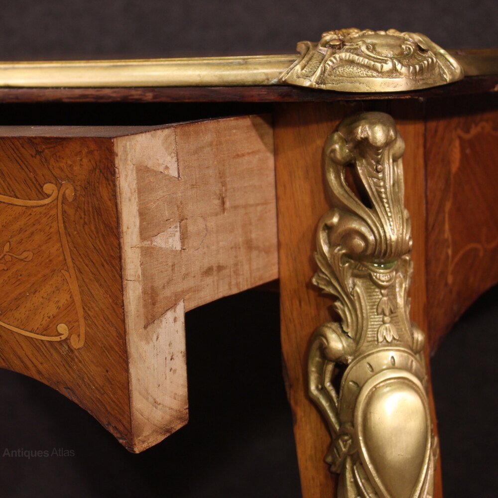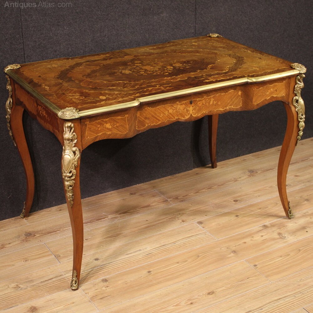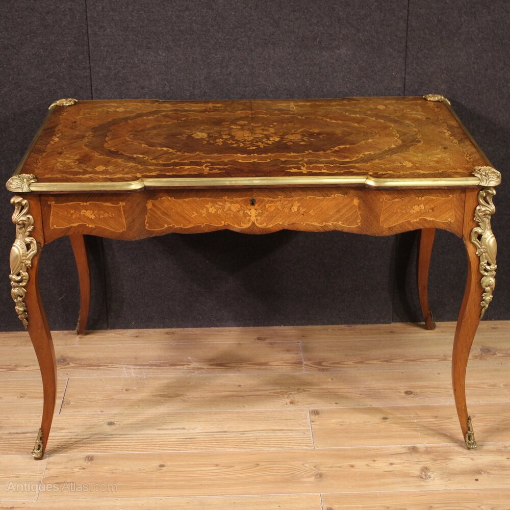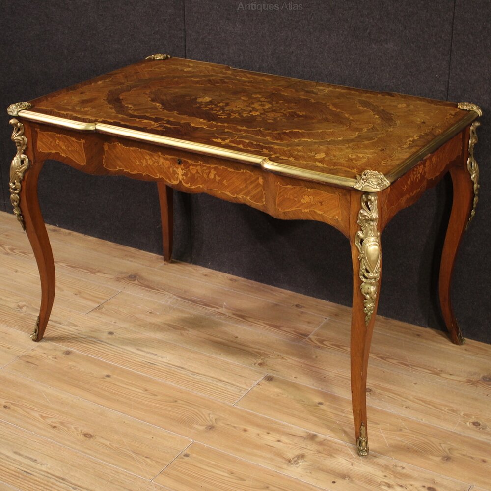 Elegant French writing desk from the first half of the 20th century in Napoleon III style. Finished for the centre piece of furniture with rich floral inlays in walnut, maple, mahogany and fruitwood. Desk equipped with a central drawer of good capacity, missing key, wooden top in excellent size and service. Desk adorned with bronze and brass elements, chiseled and gilded, beautifully decorated. Desk of excellent proportions, easily placed in different parts of the house, furniture in patina with some signs of aging (see photo). Structurally sound, it is in a good state of conservation.