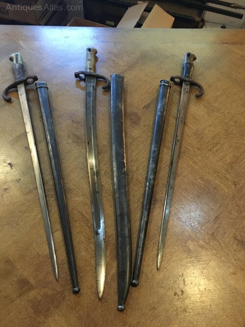 Three French bayonets two gras one chaspot . nothing wrong with them press studs work blades straight with there scabbards as they came to us uncleaned dirty rust ! all they need is. a good clean . Priced to sell I bought a few in France so just turning them over at trade money.