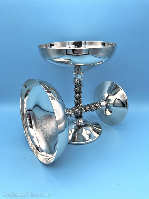 This is a very stylish pair of Vintage Silver Plated Sundae Dishes from the 1970s. The dishes have round bases, tall stems with a spiralling bark effect and a wide plain saucer at the top. Your ice cream will never have tasted so good!