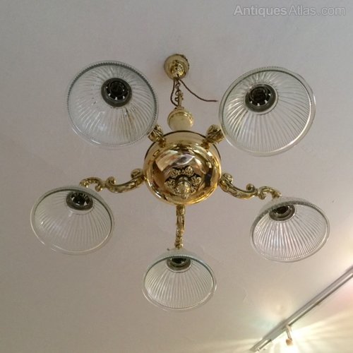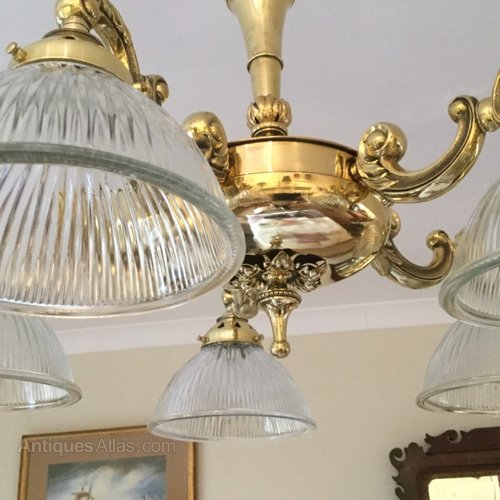 Fully restored and re wired 5 branch brass chandelier with reeded glass shades,