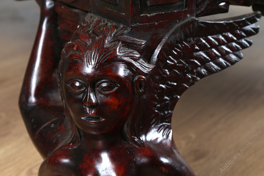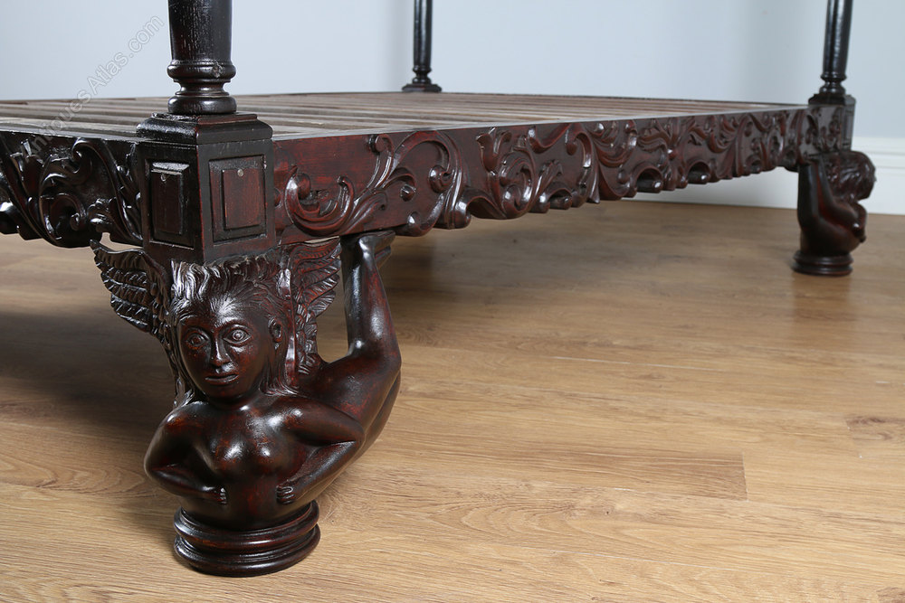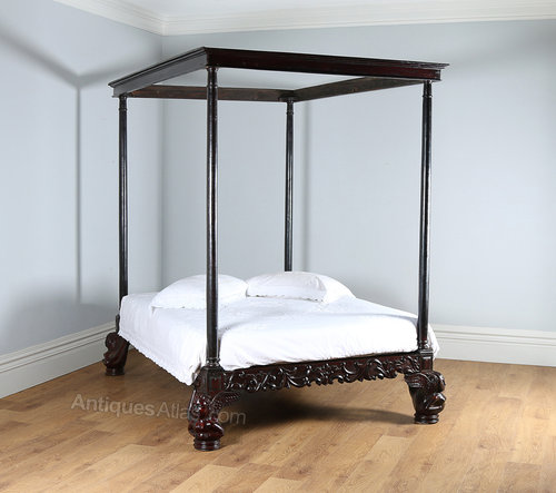 This is a rare, very good quality and early antique 5ft wide (king size), early colonial Raj four-poster day bed, boasting the original polish, circa 1880, originating from colonial India. The bed boasts a single tier structure with a heavily carved floral bed frame, incorporating a shaped frieze. The bed stands on four stunning carved angel legs, featuring wings and prominent faces. The carved frame and legs are prominent on all sides of the bed (including the back). This style of bed was designed to sit in the centre of a room this is why all sides of the bed are symmetrically carved. The bed frame attaches to four tapering ring turned posts, which support a protruding canopy. The superstructure lends itself to be dressed with romantic fabric drapes.