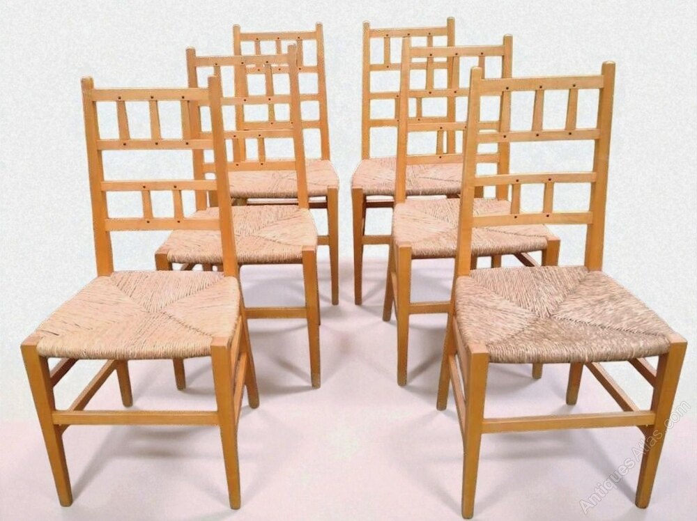An unusual and pretty set of 6 arts and crafts dining chairs in satin birch with rush seats . The tapering back legs are echoed in the tapering back splats which are held by square section ebony dowels . The dowels finish in a rounded point to match the top of the back legs ( difficult to show in a photo ) . Possibly Scottish or Austrian , the frames have been tightened where necessary , cleaned and waxed .