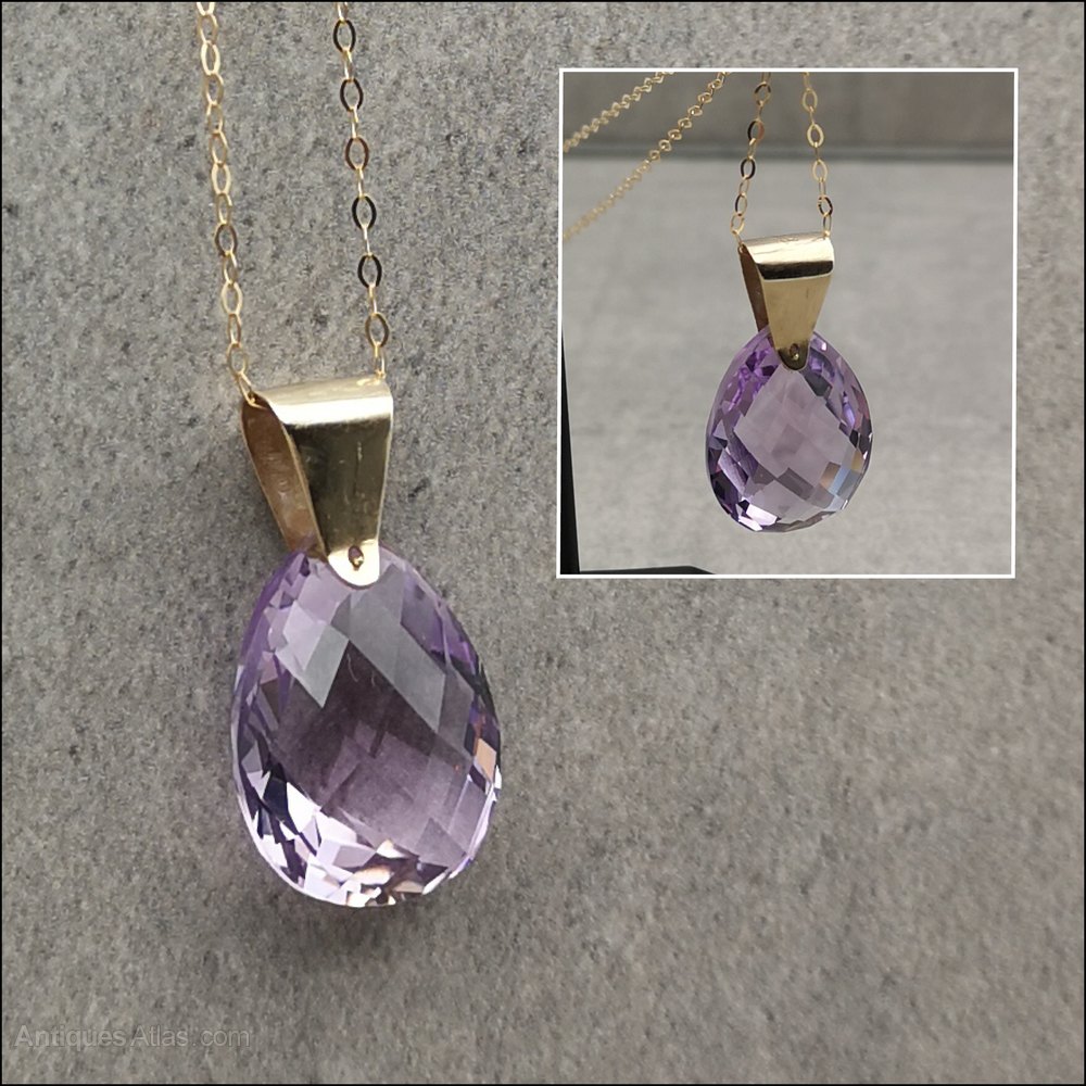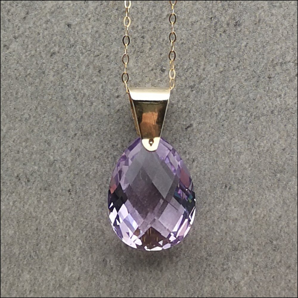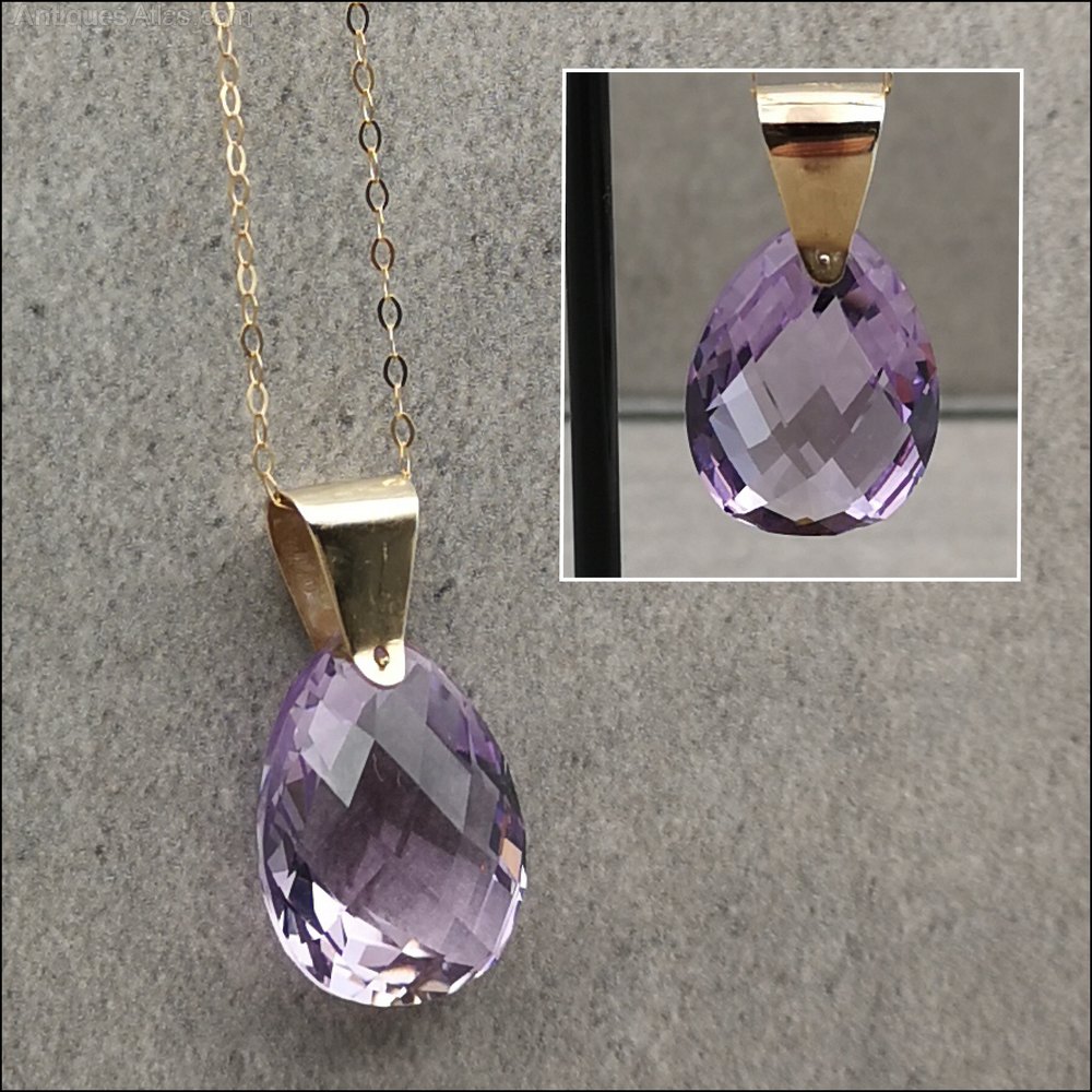 A fine vintage 9ct gold amethyst pendant with 18" chain, marked 9ct. The pendant is set with an exceptional faceted pear drop amethyst of incredible colour of approx. (15ct). The pendant measures 2.8cm x 1.6cm the total weight is 4.6 grams and is offered in good condition and is set in 9ct yellow gold unmarked but fully tested. The chain is 18"/46cm. The total weight is 5.2 gram and is offered in very good condition.