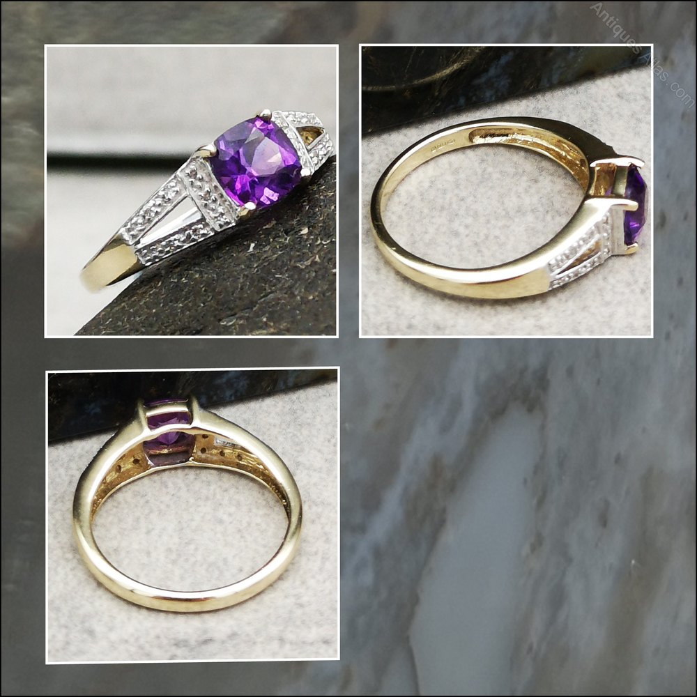 A fine 9ct Gold Amethyst & Diamond Art Deco Ring. The ring is of beautiful quality and is fully hallmarked for solid 9ct gold. The ring is set with a beautiful coloured amethyst of which the centre is (approx) 3/4ct and there is 14 x lovely sparkly 1 point diamonds set into white gold. The ring is in lovely condition and measures 2cm x 6mm and the ring weighs 2.4 grams.
