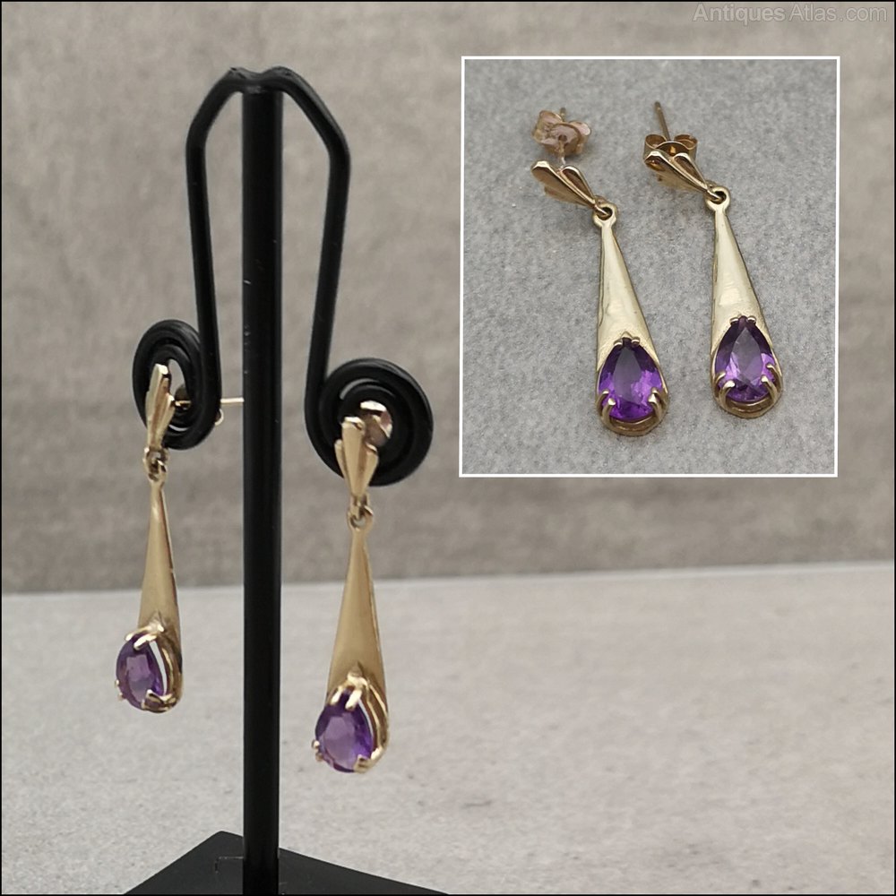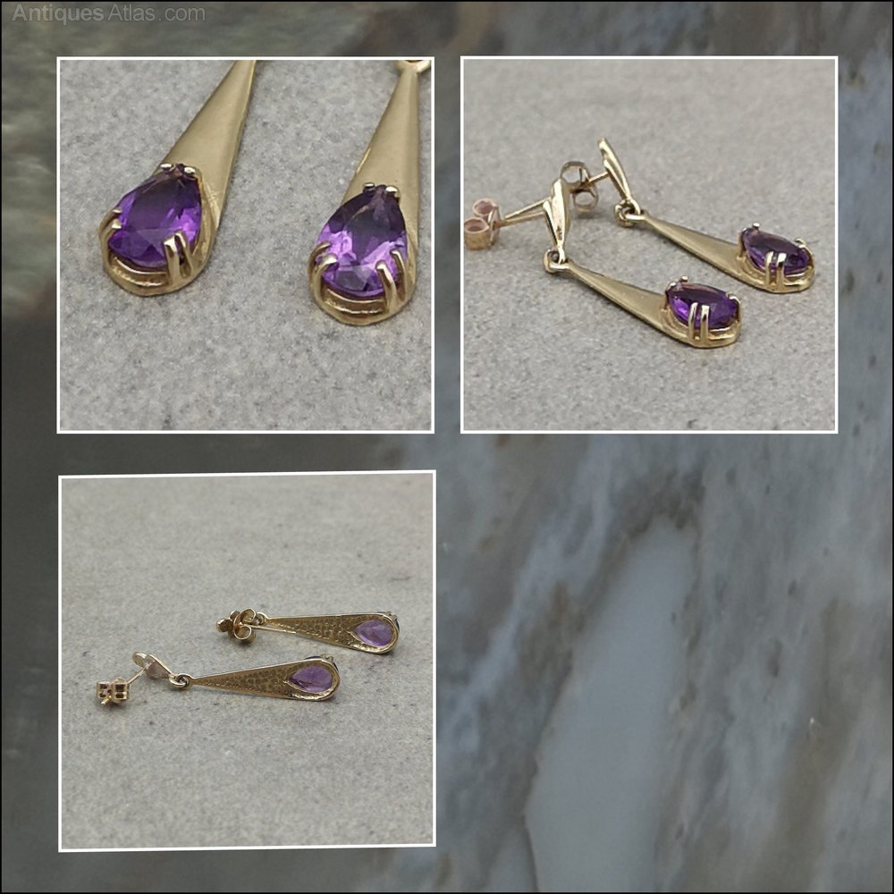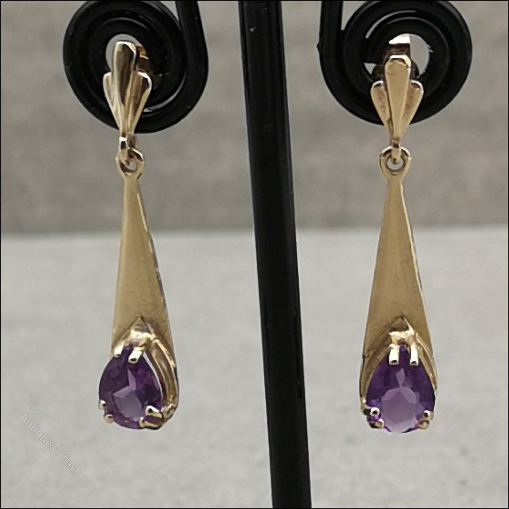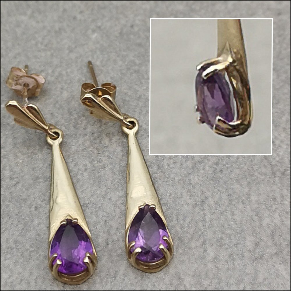 A fine pair of vintage 9ct Gold amethyst drop earrings marked 9ct. The earrings are of lovely quality and are marked for solid 9 carat to their butterflies. The earrings are set with a beautiful coloured pear drop amethyst approx (0.50ct). The earrings are of beautiful design and are in lovely condition. Each earring measures 3cm x 0.5cm. Total weight of the earrings is 1.75 grams.