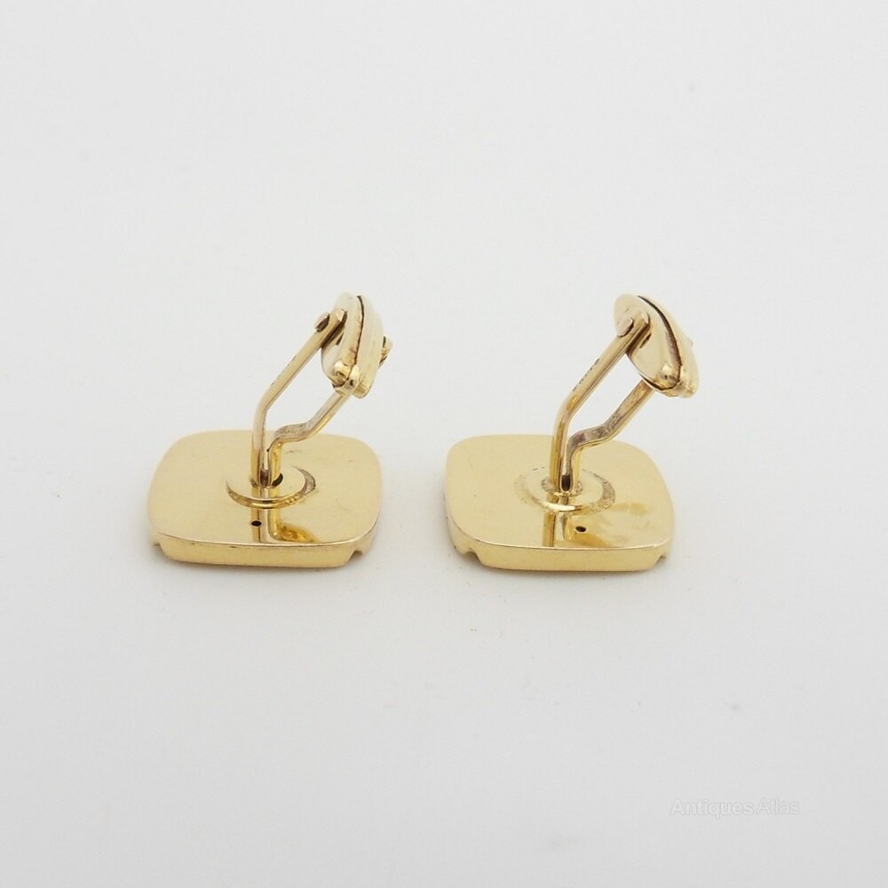 9ct gold onyx cufflinks Marked W. Germany. London import hallmarks 1974. A very handsome pair of vintage 9ct gold cufflinks. These smart cufflinks are a cushion square in shape with a square set onyx in the centre and have a bar and whale back closure. Simple, yet elegant these cufflinks would be great for formal occasions.