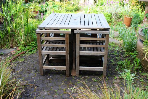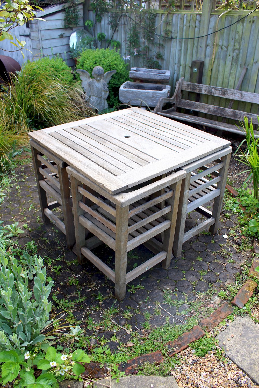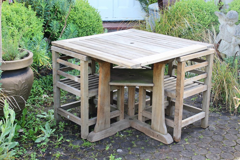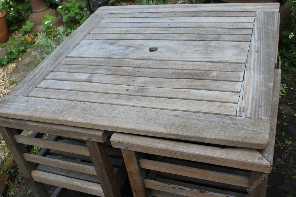A 1950`s teak garden set by Listers of Dursley with 4 corner seats fitted into a square slatted table bearing an ivorine plaque to the base inscribed Burma Teak R A Lister Dursley