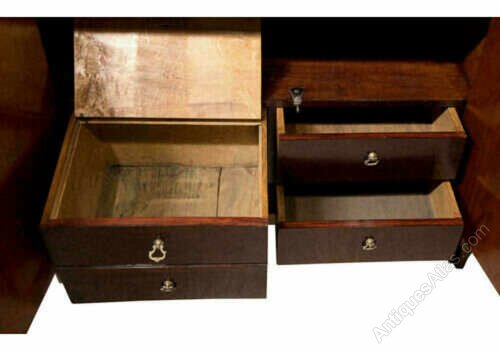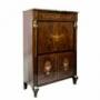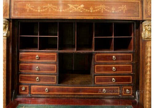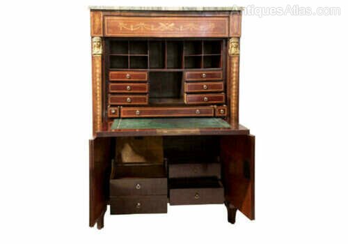 A 19th Century French Secrétaire à Abattant, the marble top above a finely marquetry-inlaid mahogany base, arranged with a single drawer over a fall-front secretaire, enclosing a fitted interior with drawers, pigeonholes, and a green leather writing surface. Below, a pair of cupboard doors inlaid with urn motifs provide further storage. The whole flanked by gilt-bronze caryatid mounts and raised on square tapering legs with ormolu sabots. A handsome and practical piece of French Empire-inspired furniture, combining elegance with utility.
