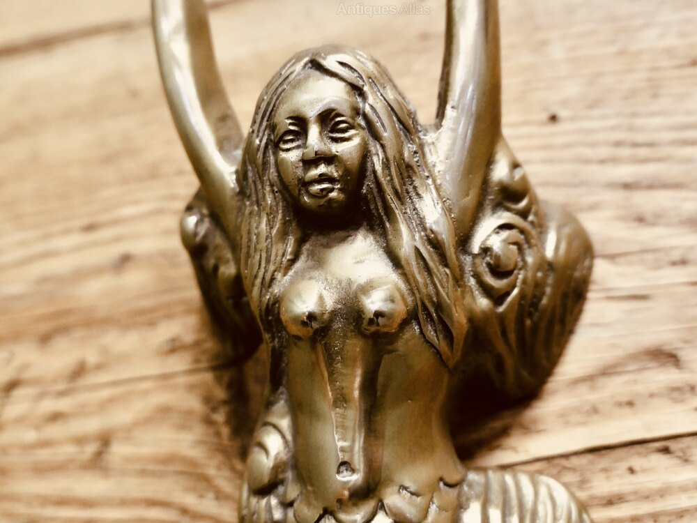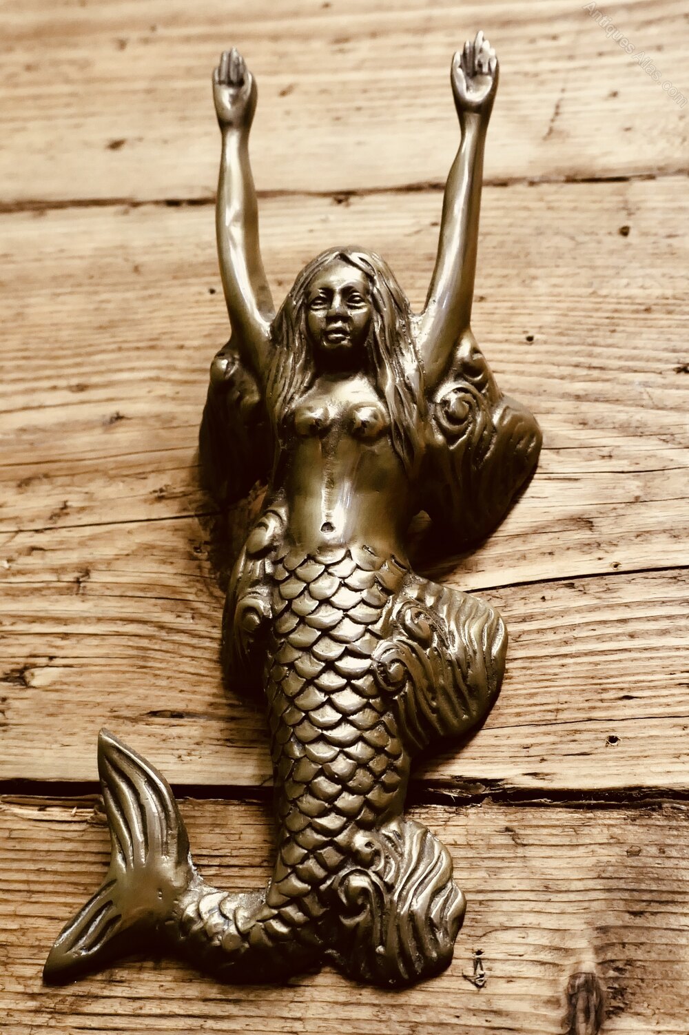 This is an unusual door knocker, it is installed by hooking it over 2 screw heads, it is then operated by flicking the mermaid’s body or pushing her arms back